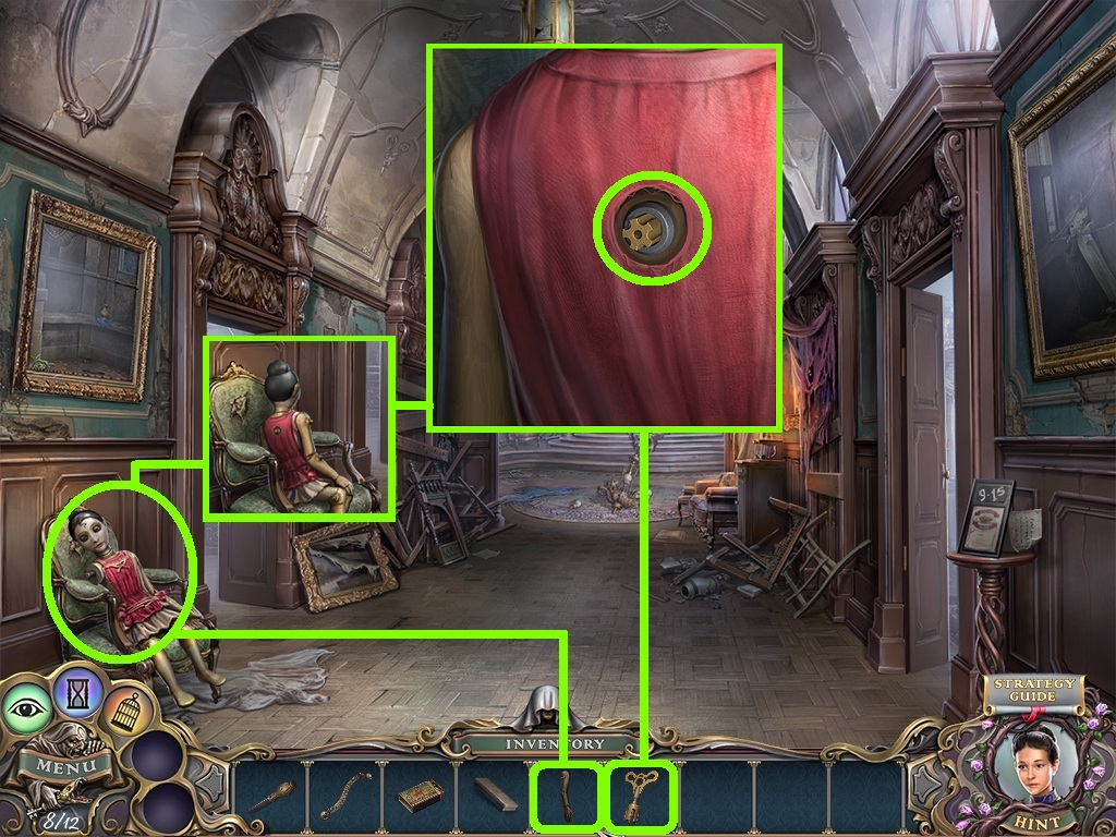 - Pick the puppet arm (green square) from the inventory; place it onto the puppet (green circle).