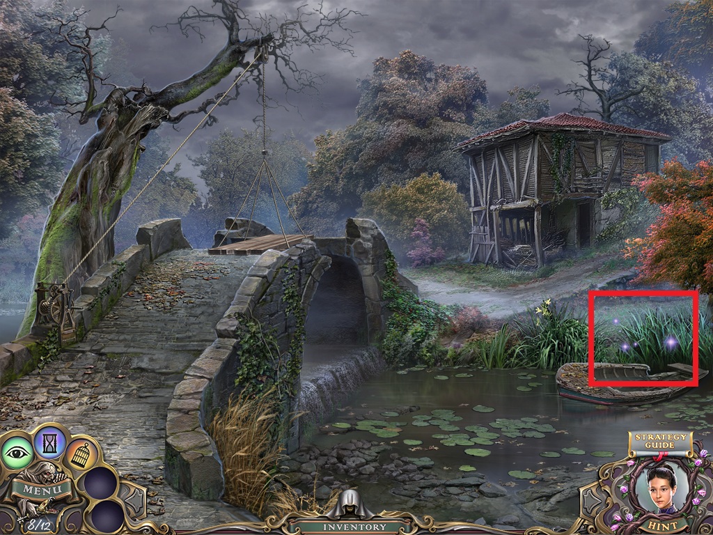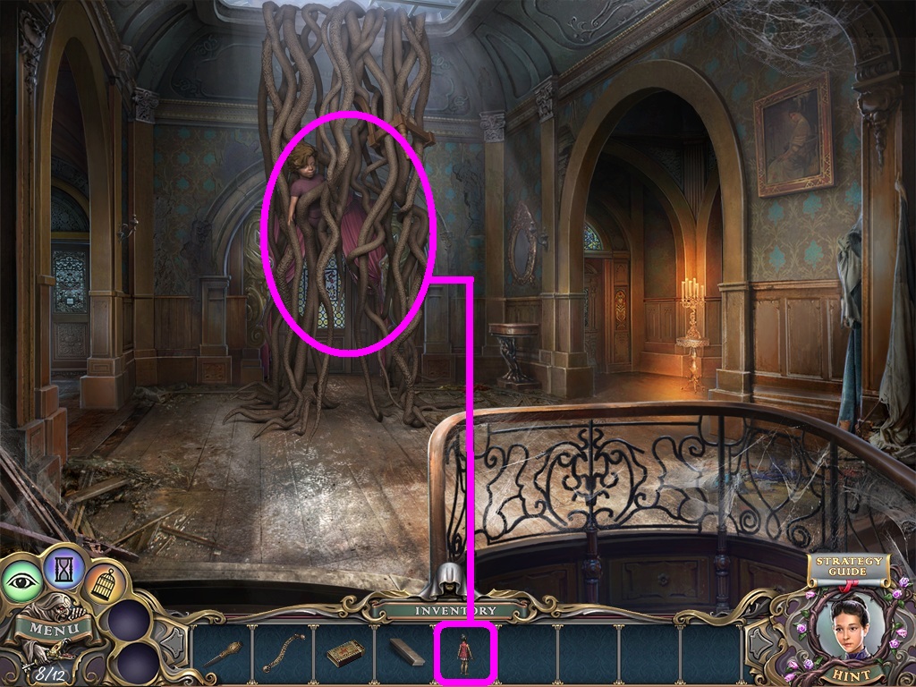 - Pick the puppet (pink square) from the inventory; place it into the vines (pink circle).