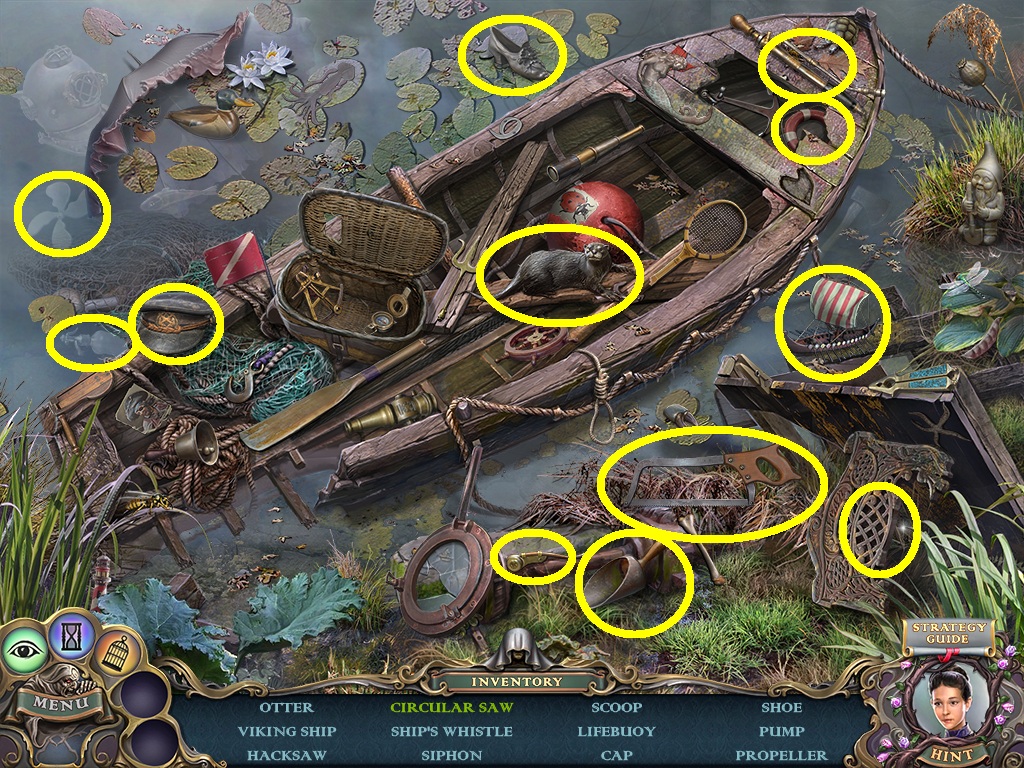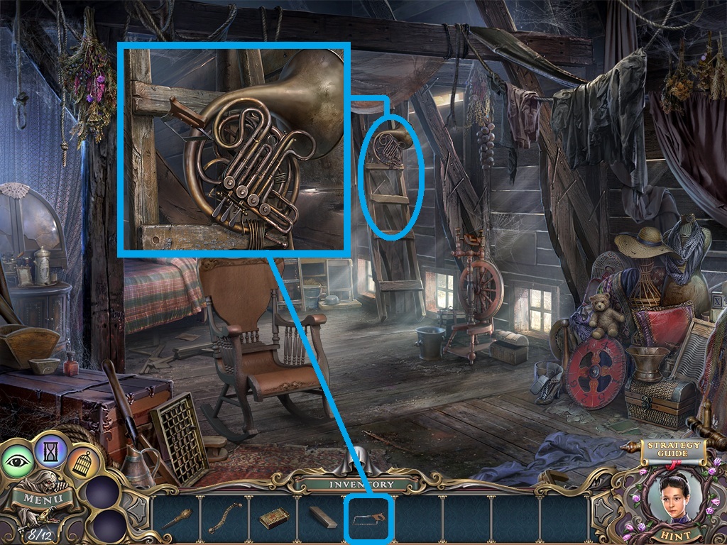 - Zoom into the ladder (blue circle); pick the hacksaw (blue square) from the inventory.