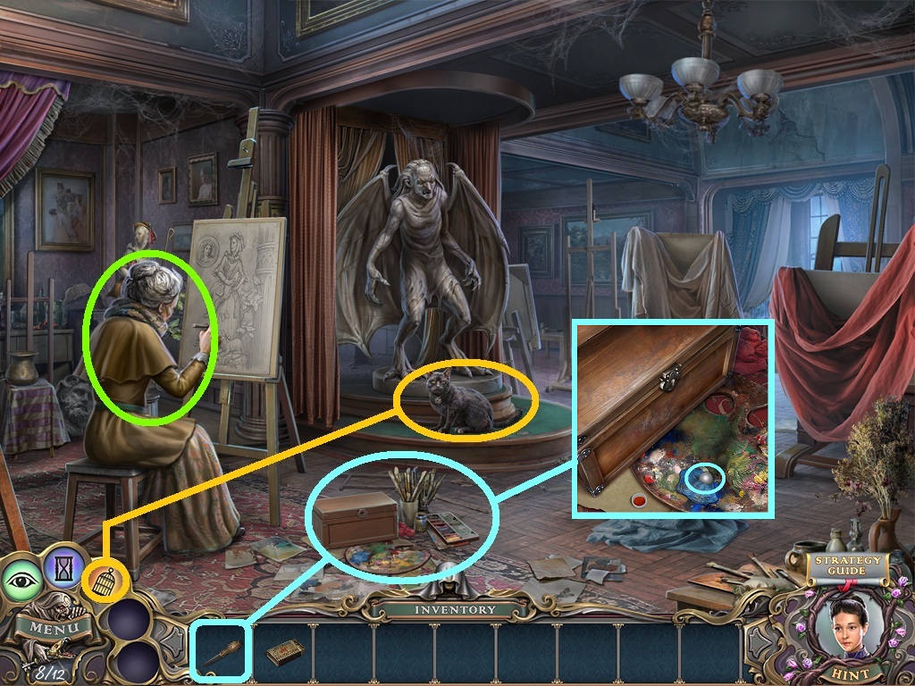 - Pick the knife (aqua square) from the inventory; use it to crack the paint.