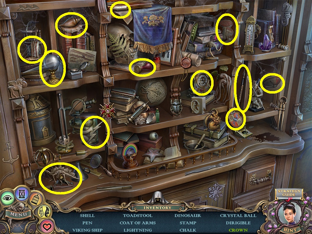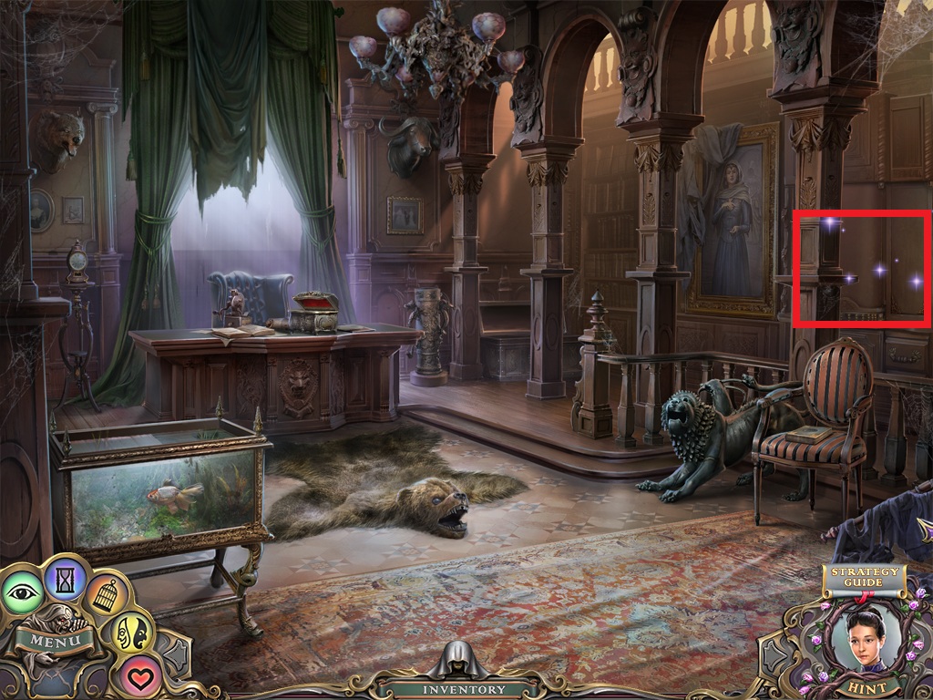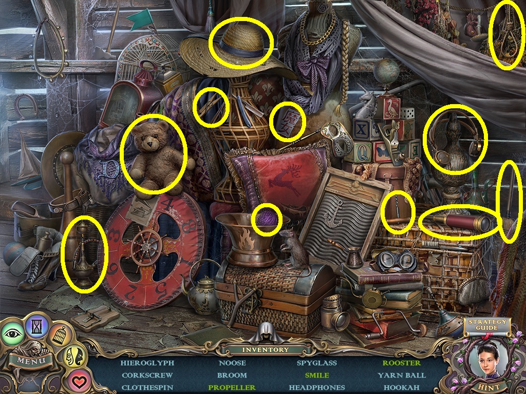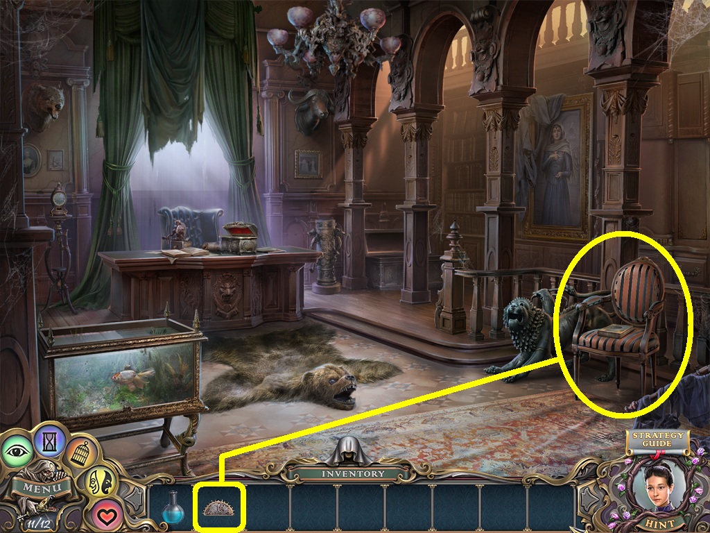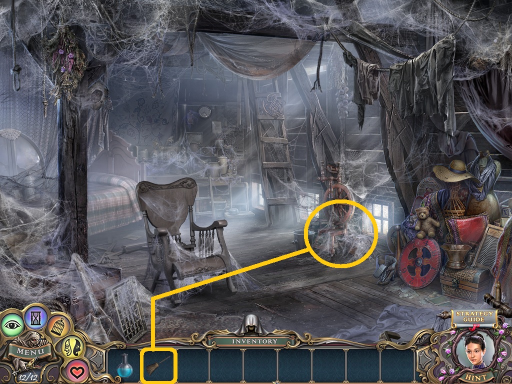 - Pick the broom (orange square) from the inventory; use it to sweep the cobwebs (orange circle).