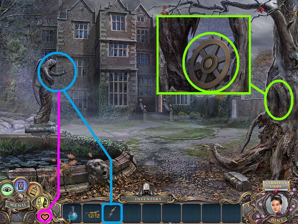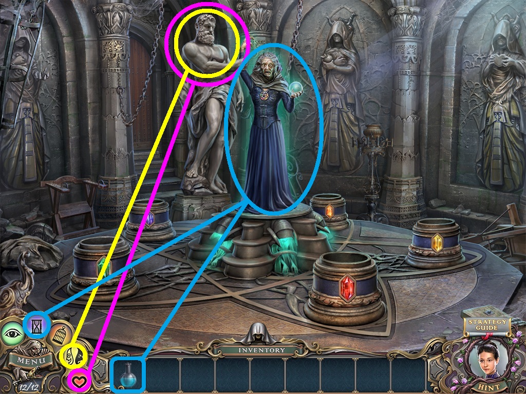 - Pick the lightning (blue square) from the inventory; place it into the statues hand (blue circle).