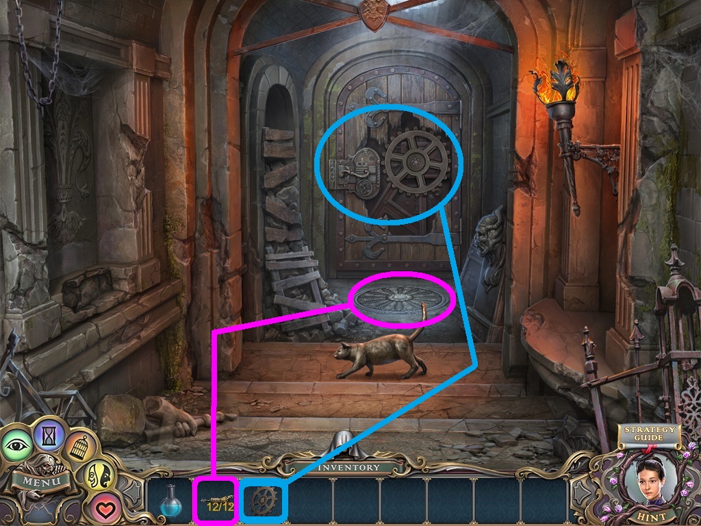- Pick the gear (blue square) from the inventory; use it on the door.