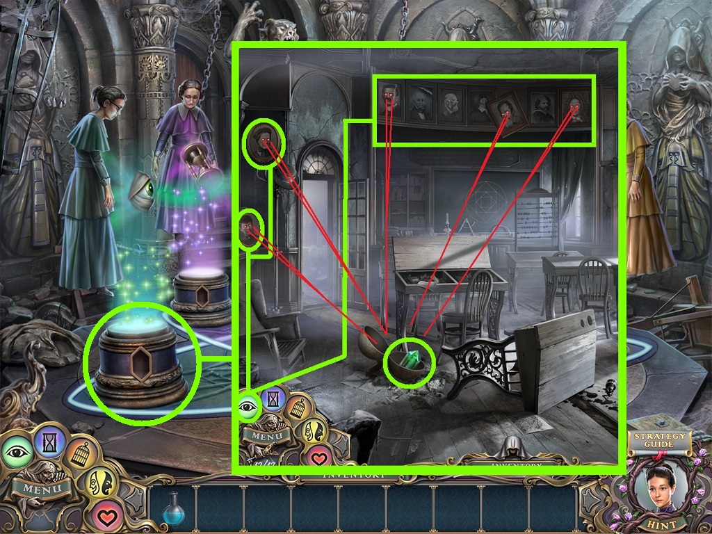 - Select the power of revelation (green circle); focus it onto all the picture frames (green squares).