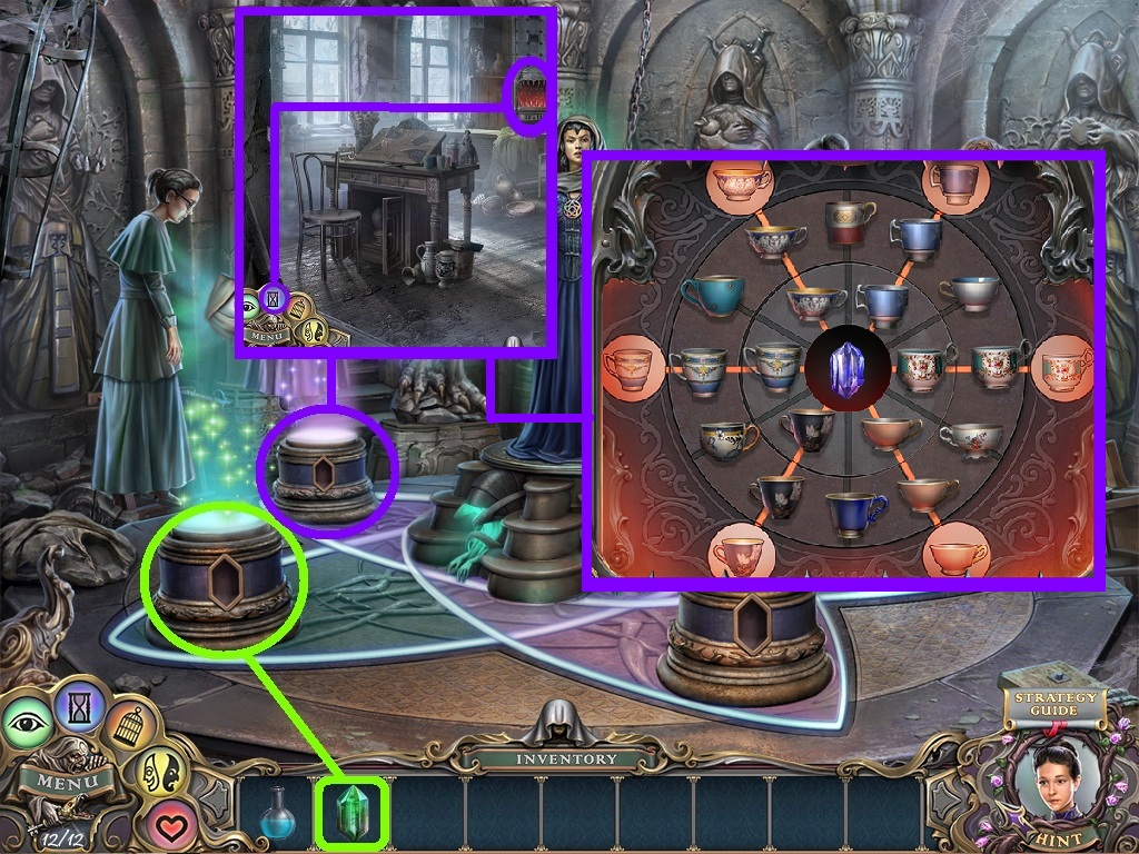 - Pick the portal stone (green square) from the inventory; place it into the missing space in the first portal (green circle).
