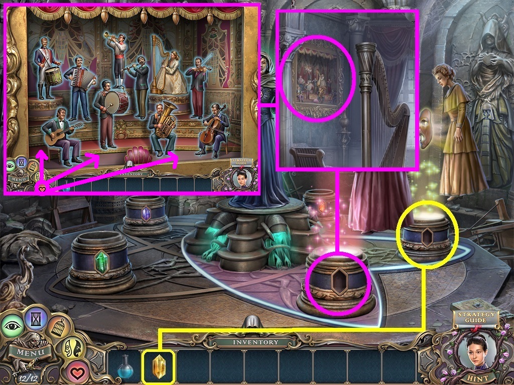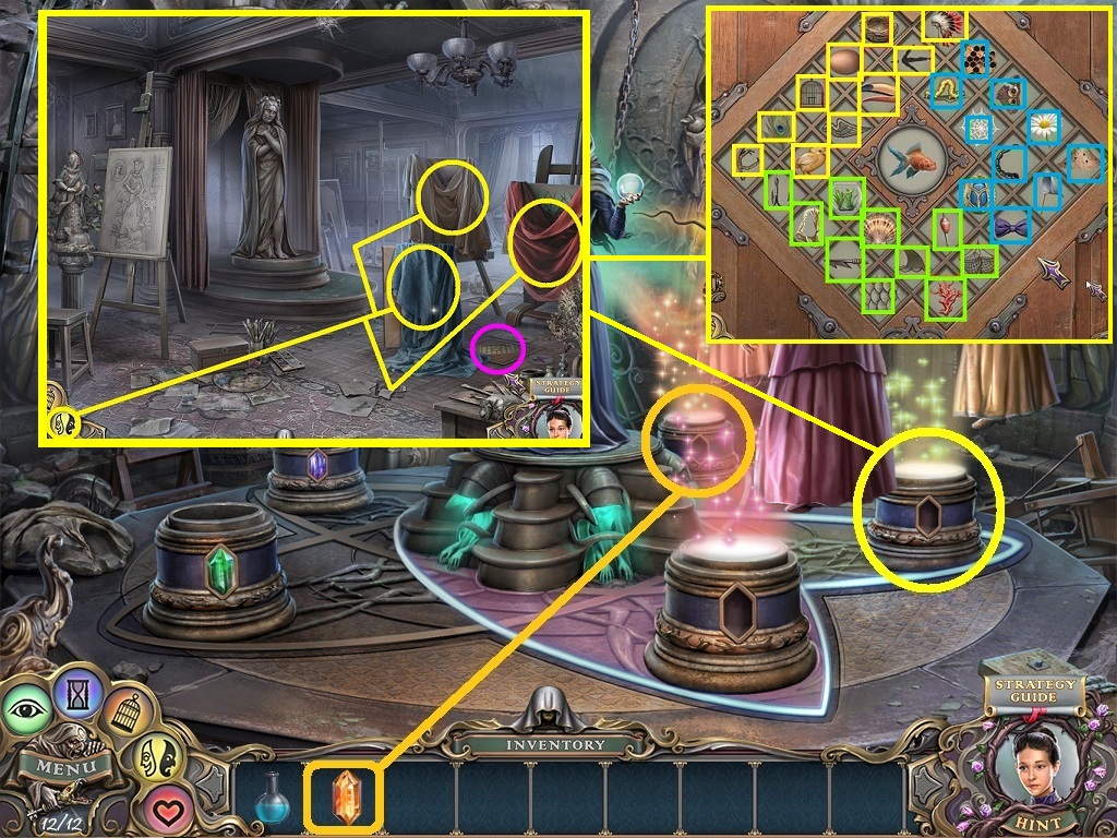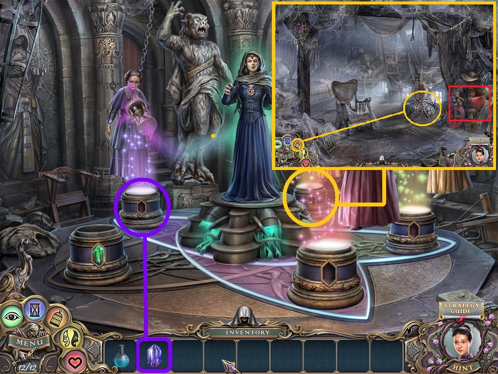 - Pick the portal stone (yellow square) from the inventory; place it into the missing space in the portal (yellow circle).