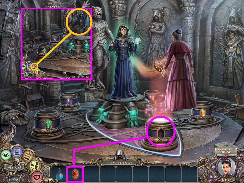 - Pick the final portal stone (pink square) from the inventory; place it into the final portal space (pink circle).