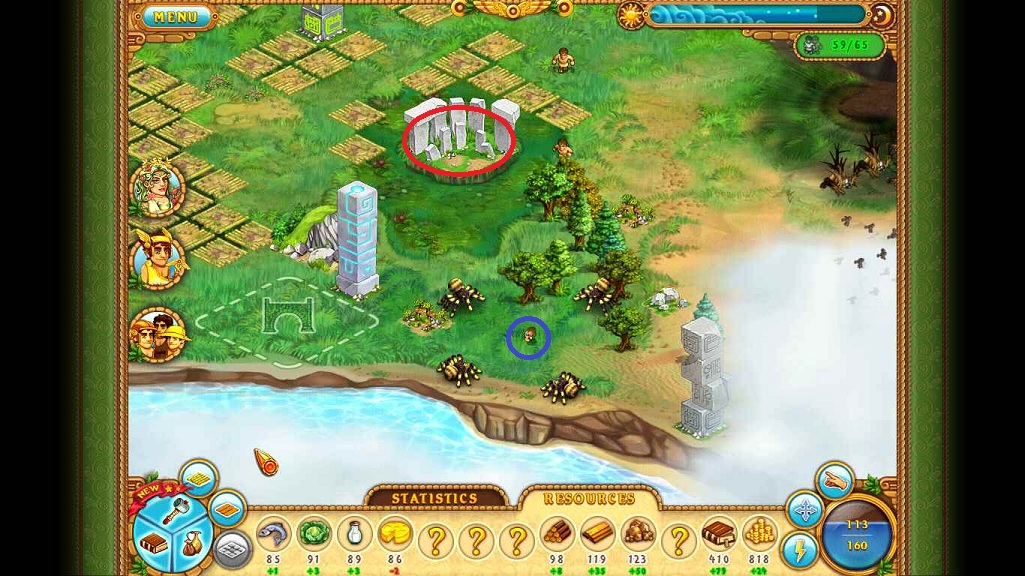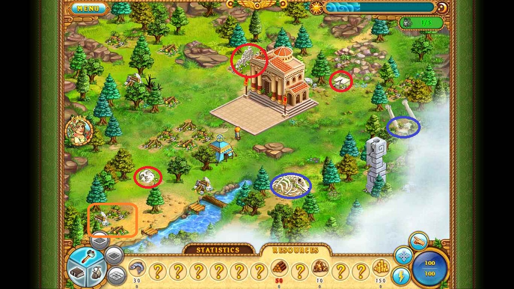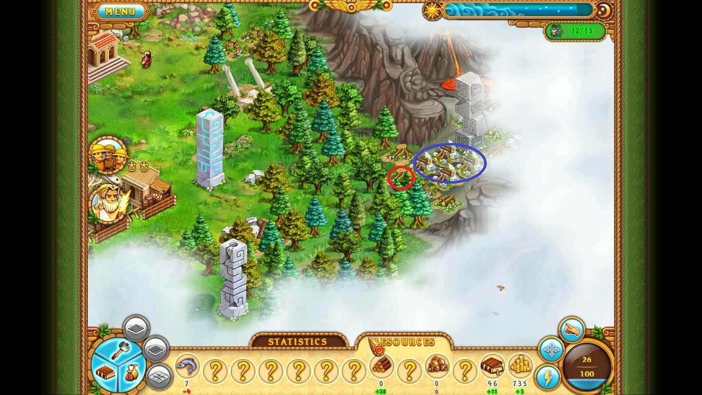 - Activate the Obelisks of the Gods and receive 20 mana. This is over on the far right. You need to remove the 4 heaps that are encircled in blue on the screenshot. There are several heaps blocking the way.