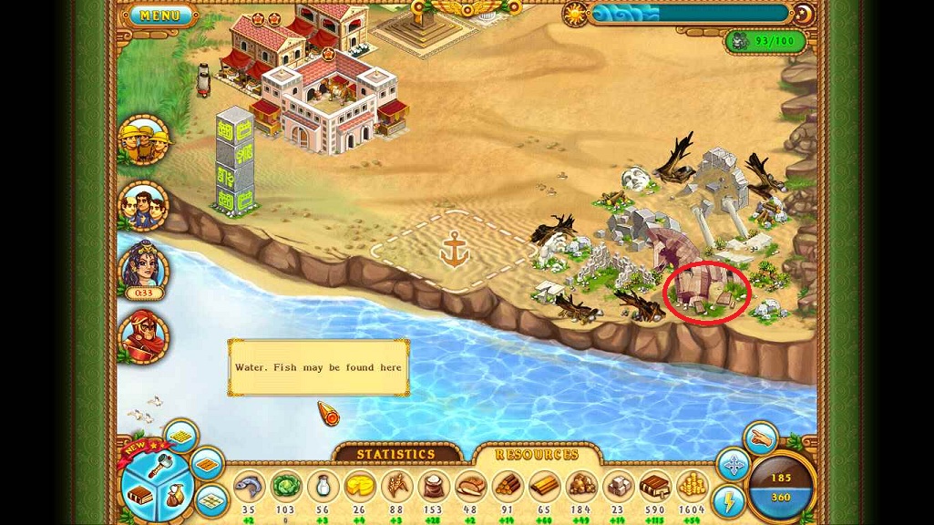 - Collect resources from the water (10 fish for 10 mana), trees (10 wood for 10 mana), the gold pile (10 gold for 20 mana), and the stone pile (10 stone for 20 mana).