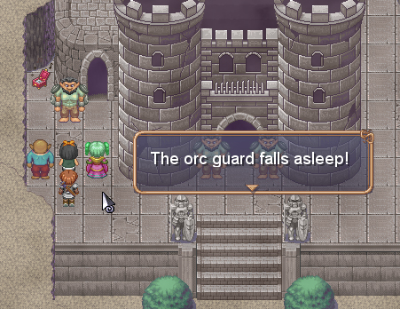 But there is still that little thing about the key… and it’s on your map that it can be found in the orc city… so trudge back to the city and head straight for the castle. Go to the king and ask pretty please for the key. Of course he throws you out on your butt, but at least you tried to ask nicely. Now, it’s Mel’s turn. Sneak around the side of the castle and talk to the guard there. Ulf suggests using music to lull him into complicity. But where can we find music? Remember that old music box that spoiled kid didn’t want anymore? Let’s use that!