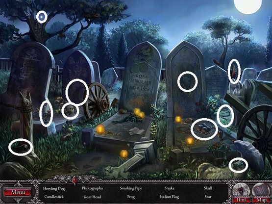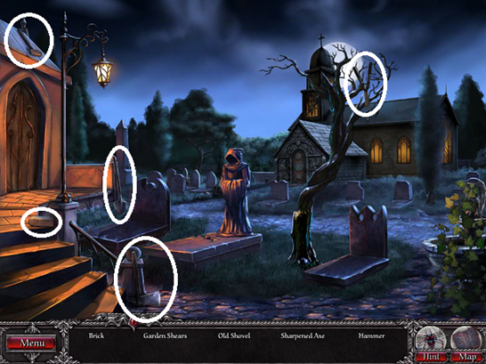 · You will then need to locate the hidden objects for the entire graveyard as shown. You will receive a brick, hammer, gardening shears, an axe, and a shovel.