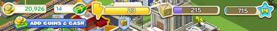 Energy Meter = The yellow lightning bar indicates your energy level. You use energy performing actions in the game. It regenerates, but slowly… You can visit neighboring cities, use batteries bought or gifted from friends, or level up to increase your energy levels. Your energy meter changes to display the reputation meter when you are visiting friends.