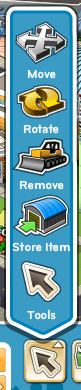 Clicking the arrow button (tools) will open a list of options for things you can do to items in the game, such as move, rotate, remove, and store items (if you have a warehouse).