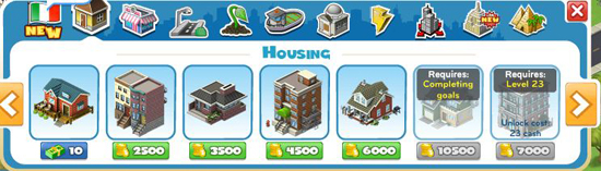 Clicking the Build button will display all of the items that you can purchase to build your city… many items are locked until you complete goals or gain additional levels in the game. You’ll be able to buy housing for your citizens, businesses, decorations, farming supplies (in CityVille, farming allows you to create goods to keep your businesses running), shipping supplies, community buildings (which are needed to increase your population limit), energy, city expansion, and the ever growing additions of landmarks and wonders… It’s limitless!