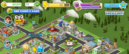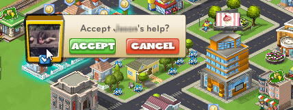 Your neighbors can also help you out around your city, by collecting rent from your residences and sending tour buses to your businesses. If a friend has helped you out, you’ll see their picture nearby an area of your city. Click on it, and you’ll have the option to accept or decline their help. If you accept, the areas where the friend has helped will turn blue, and you’ll see your friend’s image bounce around those areas, and your coins and experience will be available for collection.