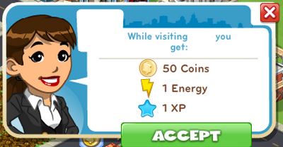Visit your neighbors’ cities often to gain additional experience, coins, and reputation points! Each time you visit a brand new neighbor for the first time you will be rewarded with 100 coins, 3 Energy and 1 XP. Pretty nice for just saying hi! After that, visiting friends daily gives you the 50 coins, 1 Energy and 1 XP.