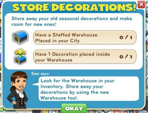 After you reach level 12, the Warehouse goal will allow you to build a warehouse so that you can store decorations that you already have but don’t want to use in your city. To complete the goal, you’ll need to find some neighbors willing to work in the warehouse as staff , and then you’ll need to place a decoration inside it. To start, you'll only be able to hold three items inside your Warehouse, but it can be expanded. To do so, you just look inside your Warehouse and click on the "Add More Space" button. From there, you'll need to get your neighbors to help you expand your Warehouse; each neighbor that helps counts as one additional storage space.