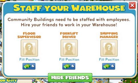 Keep in mind that your population should always remain below your population limit. If not, you make your citizens unhappy. Unhappy citizens don’t work, don’t go to businesses, and thus your city will not grow and be successful. To increase your population, you can purchase community buildings. Keep in mind when you purchase buildings that you need energy to actually construct the buildings, and then often you need friends to either work in the building or send you items in order to complete the construction. There is also an option to pay CV Cash per every position you need filled or to purchase needed items. Suffice to say, the more neighbors you have, the better!