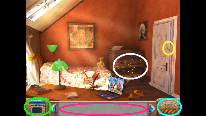 1. Start in the bedroom pictured above. Click on the yellow sparkles.