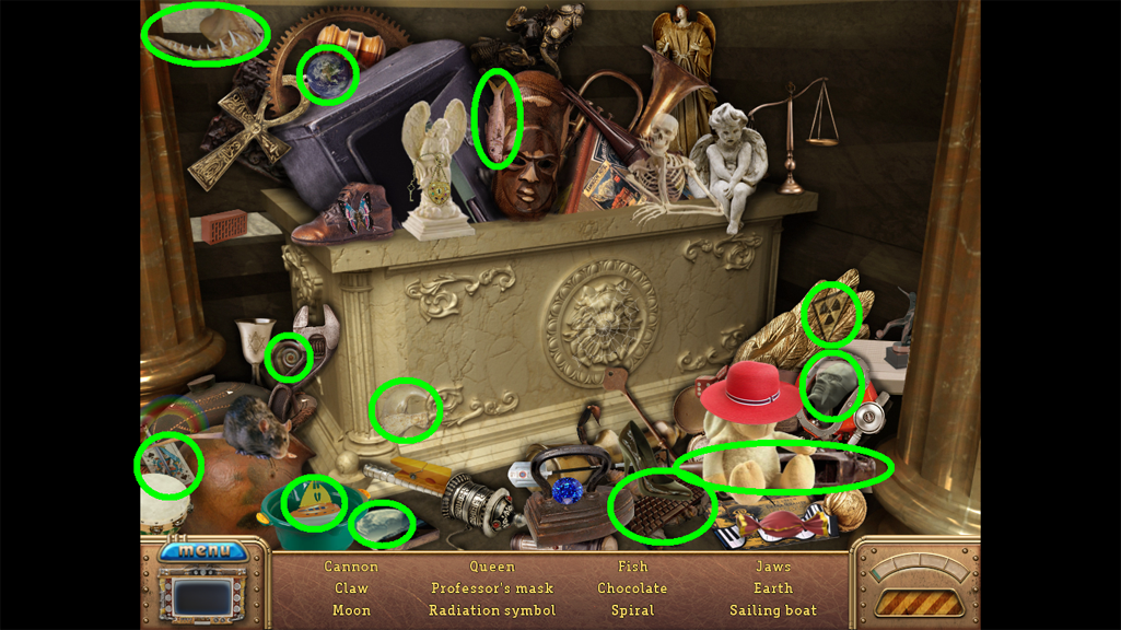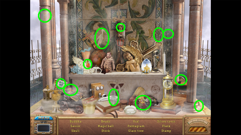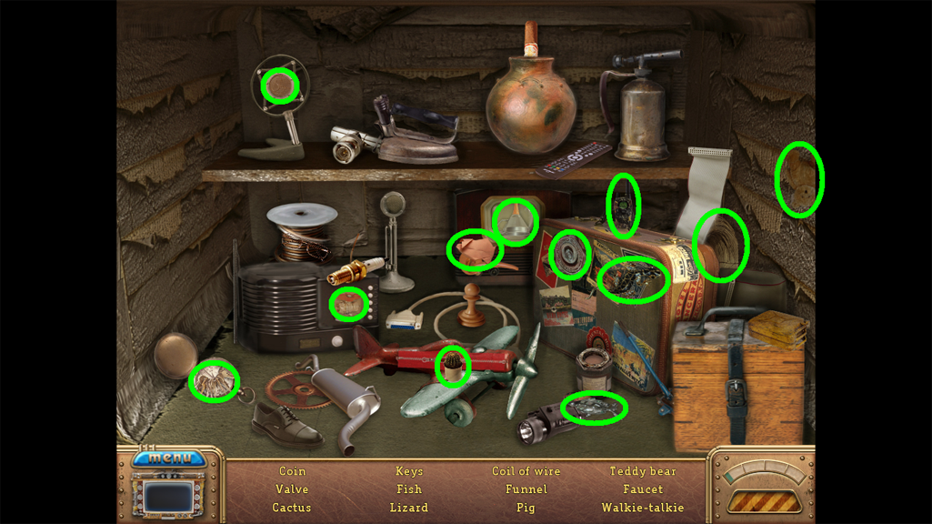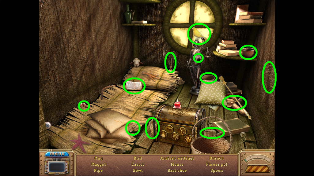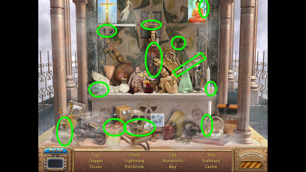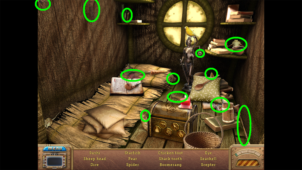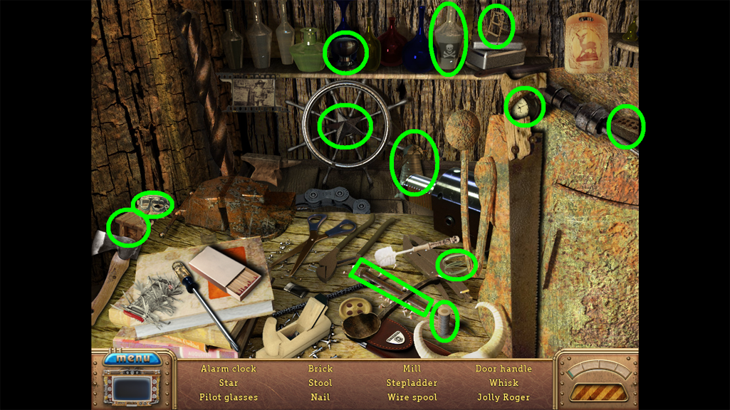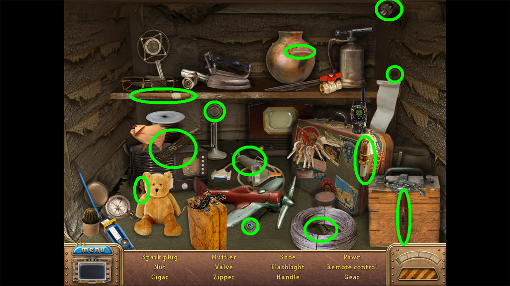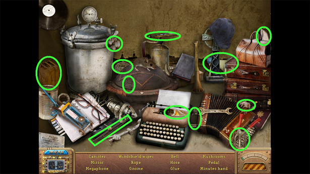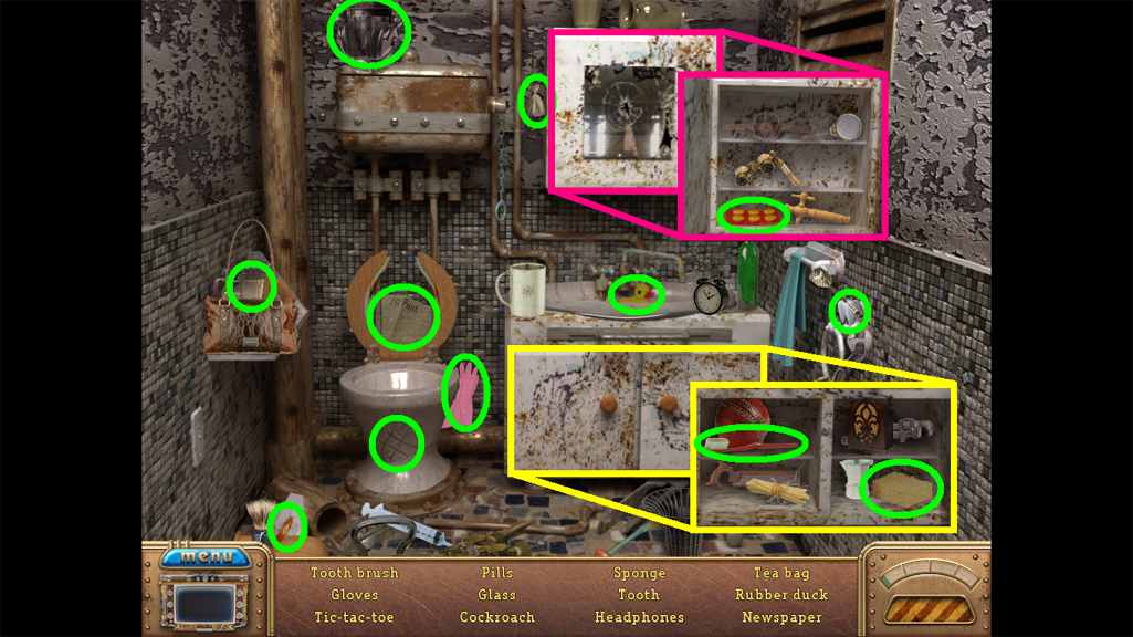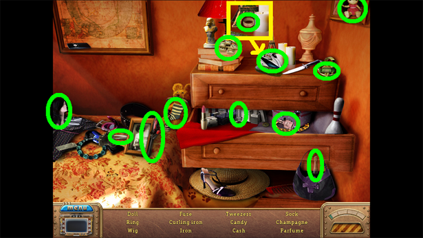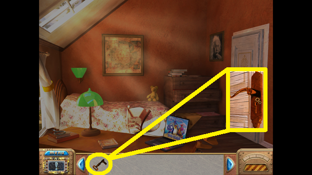 2. Find the hidden objects listed in the inventory (as circled in green). The game will automatically add the Key to your Inventory after you have located all items (yellow).
