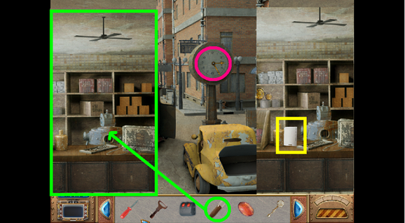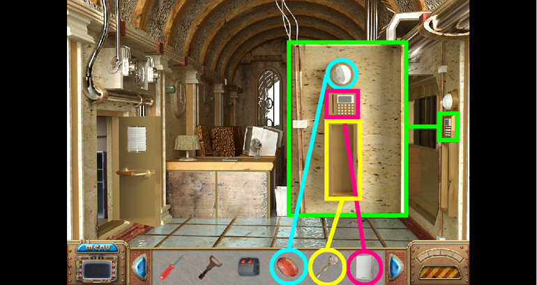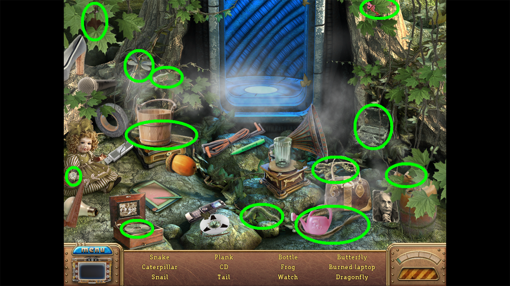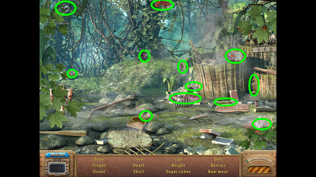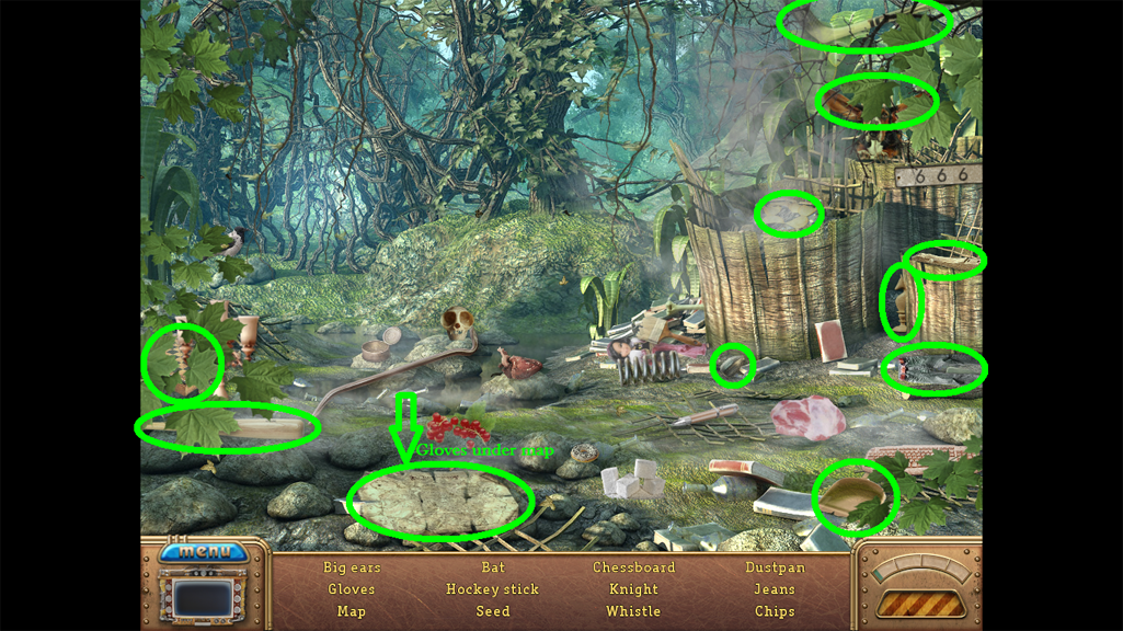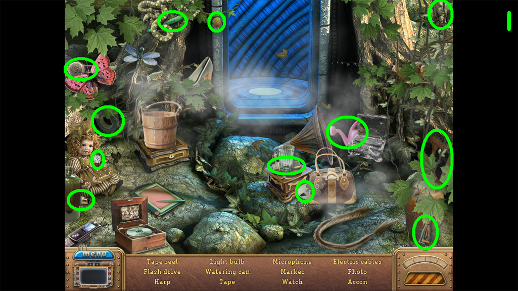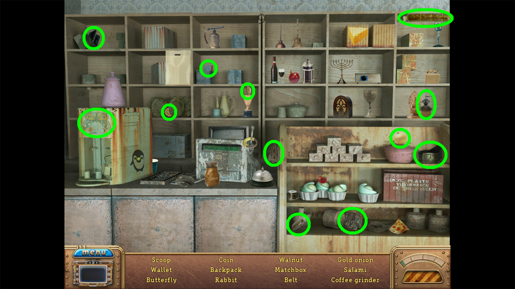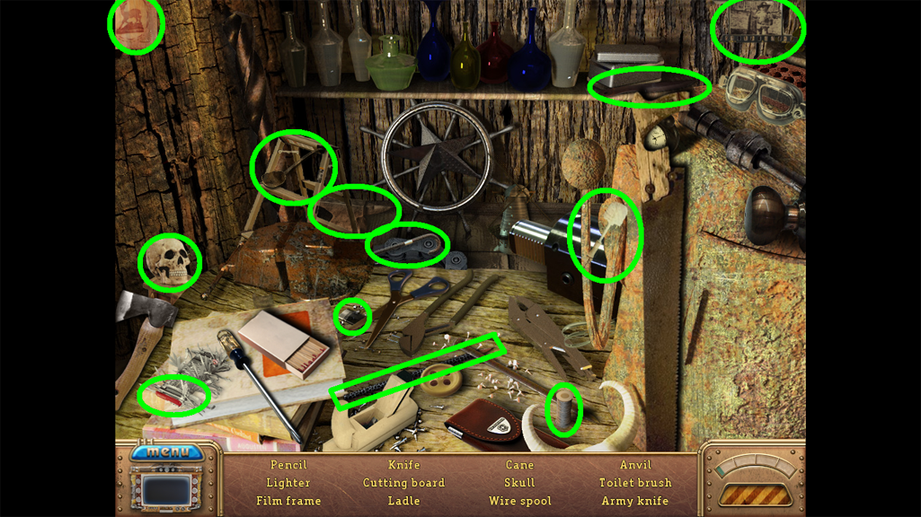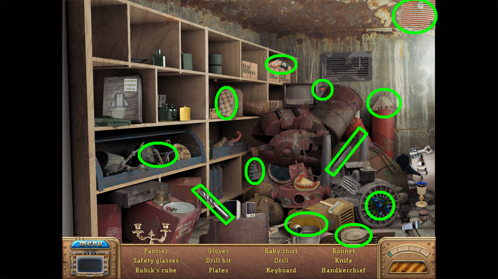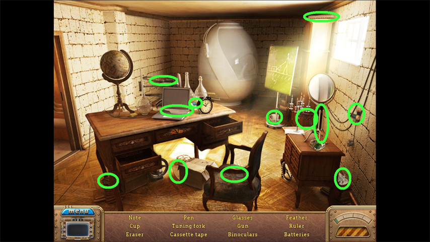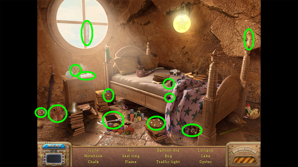 2. Find the hidden objects listed in the inventory (as circled in green). The game will automatically add the Key to your Inventory after you have located all items (yellow).