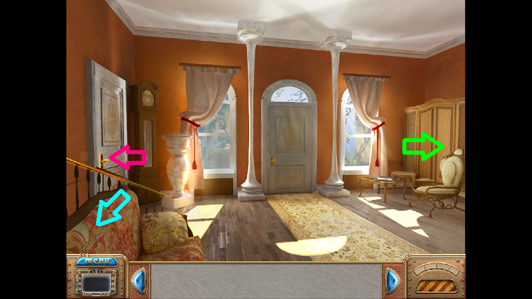 6. Go to the right to the Living Room. Notice the crooked picture (green box). When you see the eye hover over it, click to reveal a clue (green circle). Then click on the Journal to receive a task (Fuchsia).