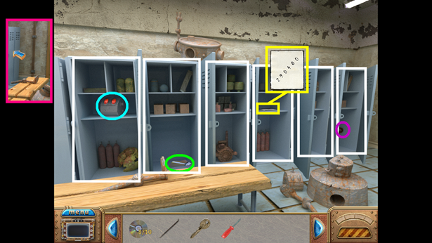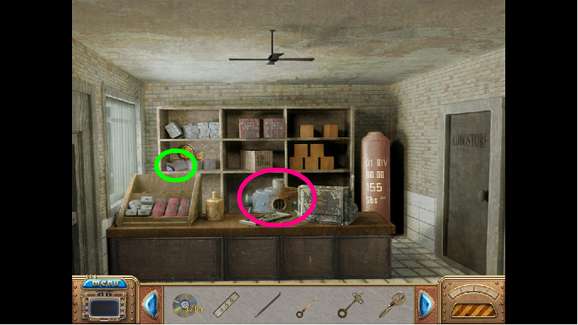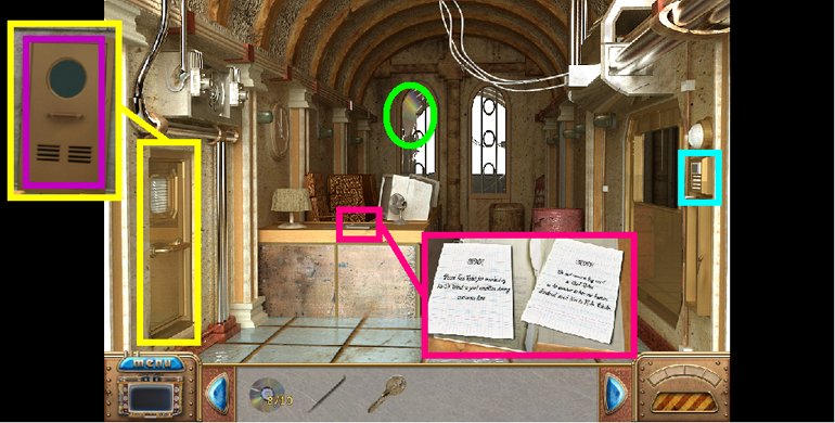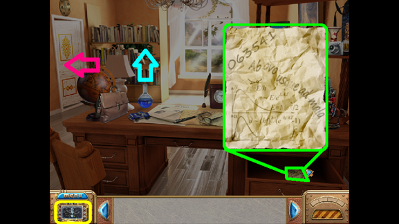 11. Find the hidden objects as shown (green). For the bug you must click on the center drawer to open it. For the piece of paper, you must click several times on the pile of papers (fuschia) and then take the paper.