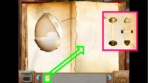 13. Drag the Page from your Inventory to the blank right side of the book (green). The piece will then show you the items you must find (fuchsia). Then click on the book to close it.