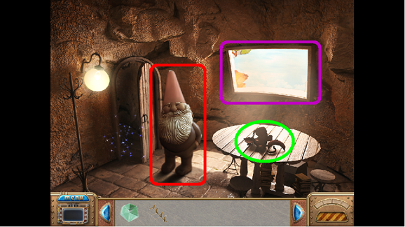 • The bottom center (fuchsia) is your Inventory and will store items you need to complete your tasks. It will also hold your Hidden Items list when appropriate.