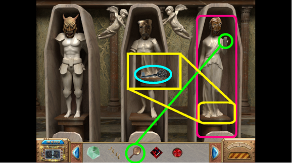 63. Take the Emeralds and the Mask from under the Statues (fuchsia).