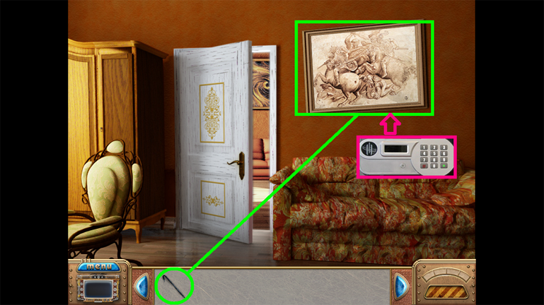 19. Behind the picture, find a security panel to a safe (fuchsia). The code in is your Journal, but you cannot yet enter it until there is electricity in the house. Click on your Journal.