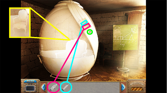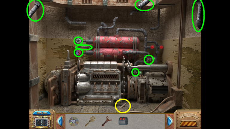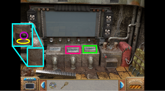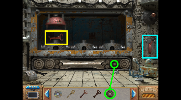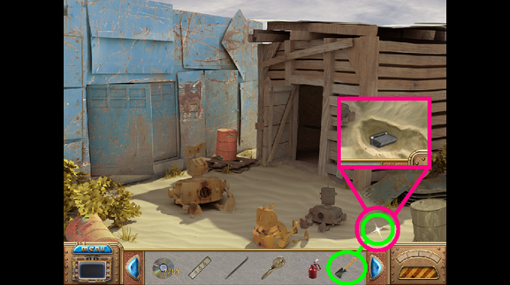 • The hand (yellow) is one of the four cursors that appear during the game. The hand indicates something you can grab or take. When it is an eye, you can look more closely at the area. When the cursor becomes a pair of gears, you need to apply an object to the area. Lastly, when the cursor becomes an arrow, it means you can go in that direction.