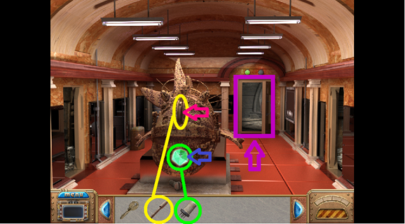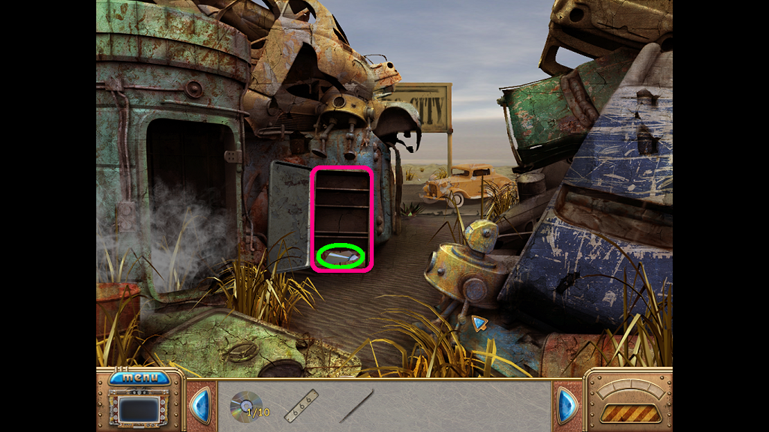 8. Click on the door in the center of the scene (pink). Take the CD piece (green).