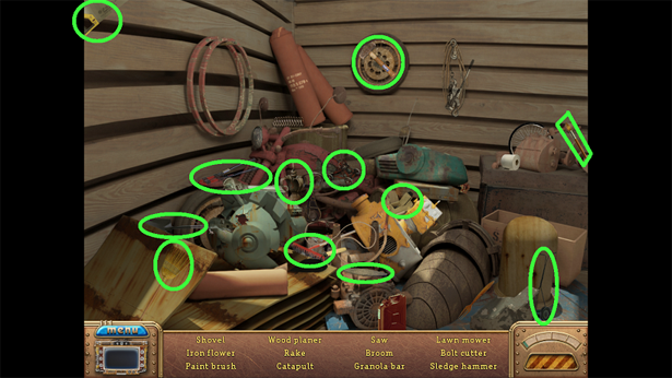 16. Click on the sparkles for a Hidden Object scene. Locate all items listed as shown. You will receive the Crowbar.