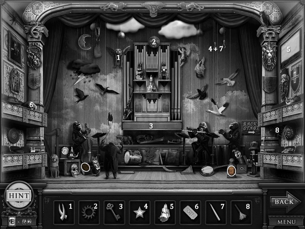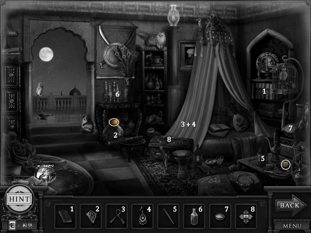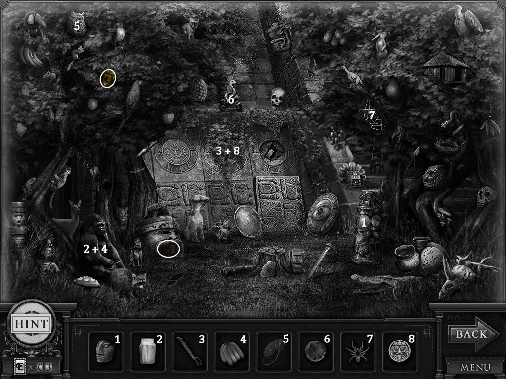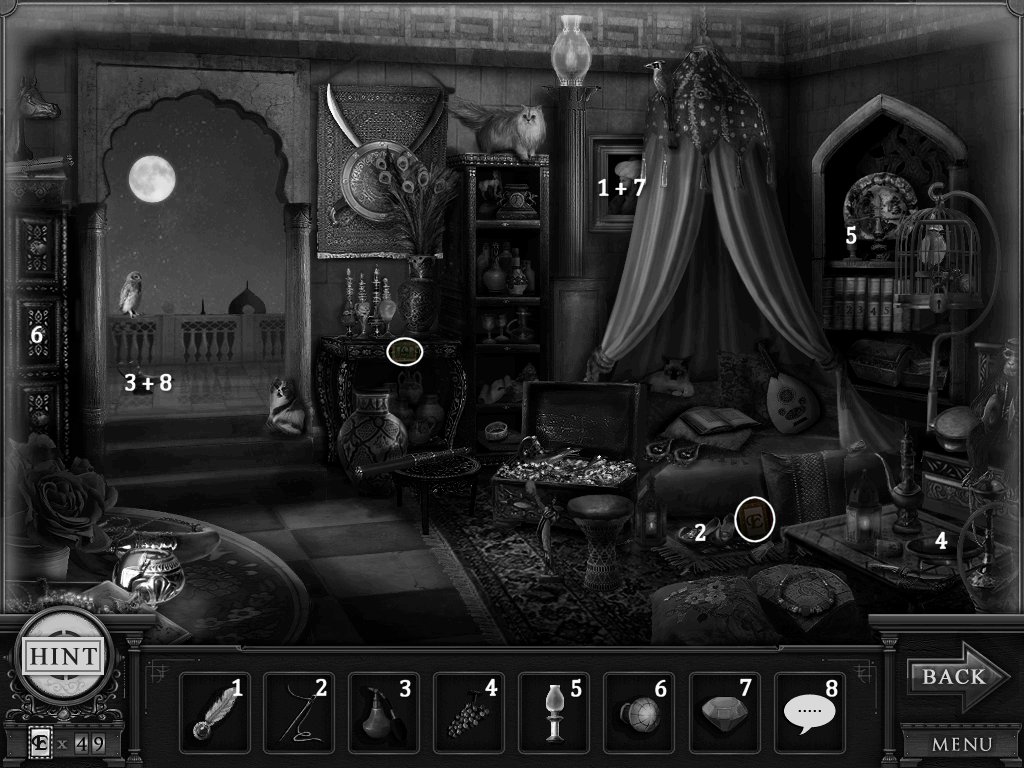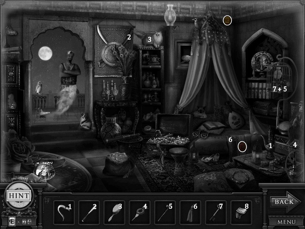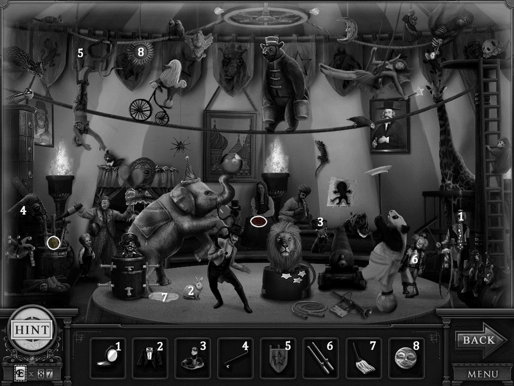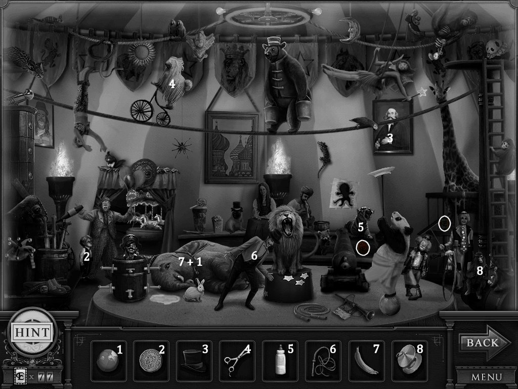 Hidden Objects: The objects aren’t actually hidden in this game. The objective is to match the object in the bar at the bottom to an object in the scene. Example: Spider + Web.