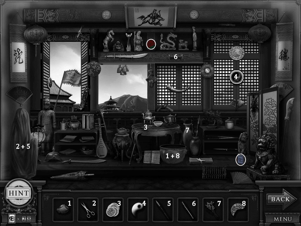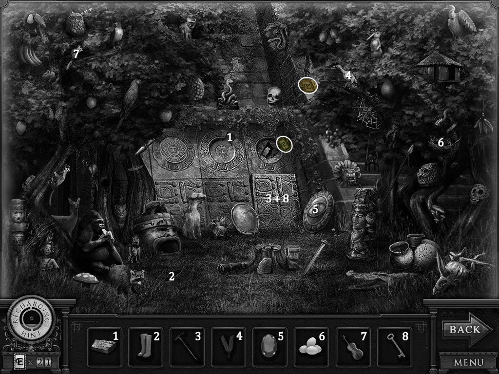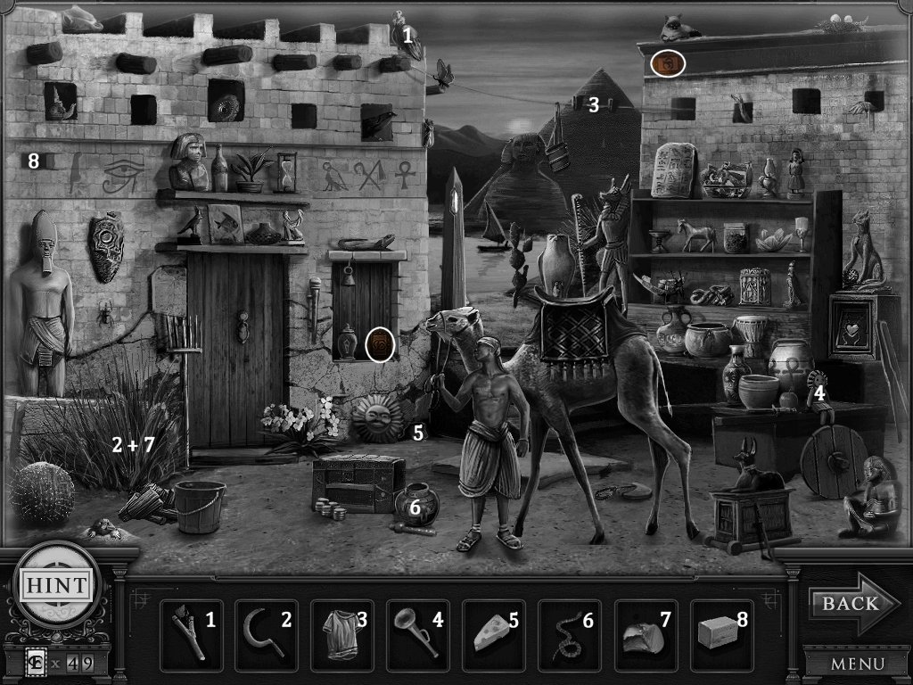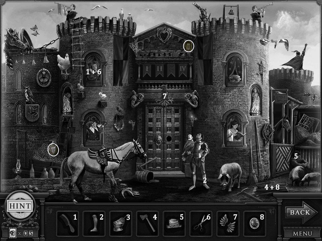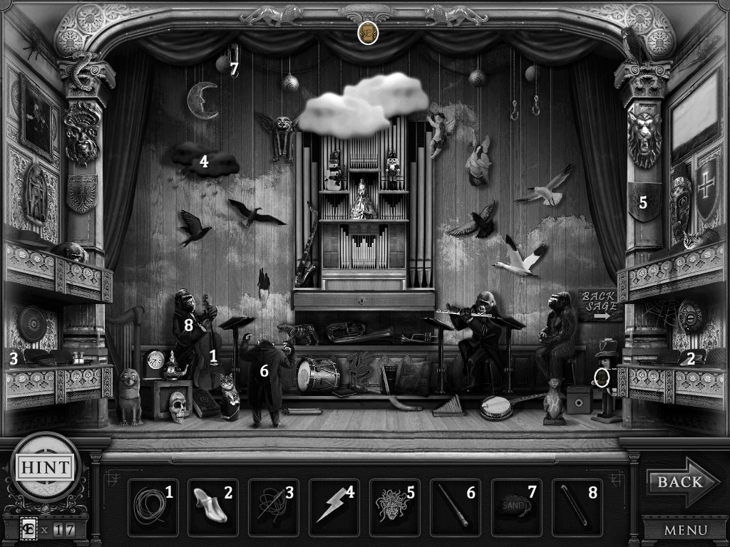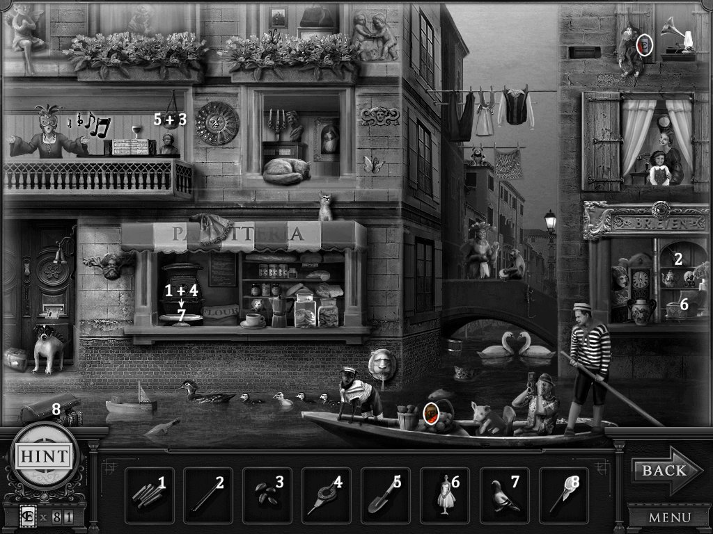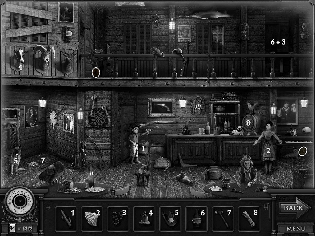 Hidden Objects: The objects aren’t actually hidden in this game. The objective is to match the object in the bar at the bottom to an object in the scene. Example: Spider + Web.