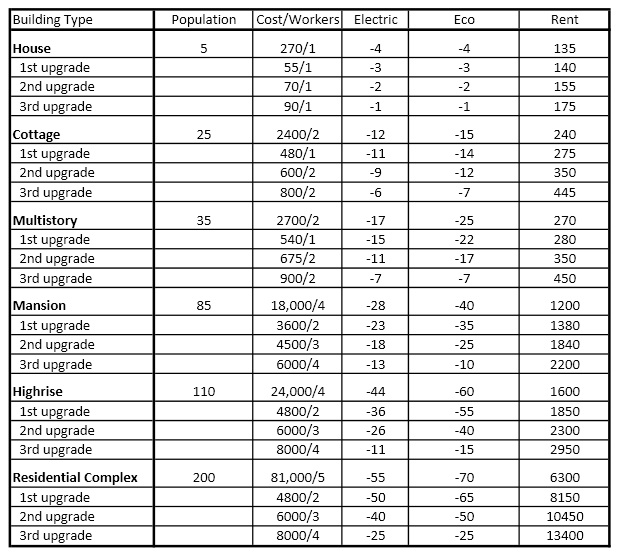 • Increasing rents with eco construction:  Each promenade, park, or reserve that touches a housing building will increase the eco.  When full upgraded, each unit will increase the rent between 21% to 25%.  For rent increasing, you would want to put as many promenades around a building as you can manage.
