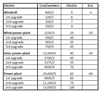 • Water purification stations and air monitoring stations use electricity and they boost the total eco by a certain percentage based on which building and how upgraded it is.