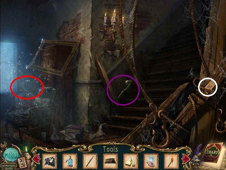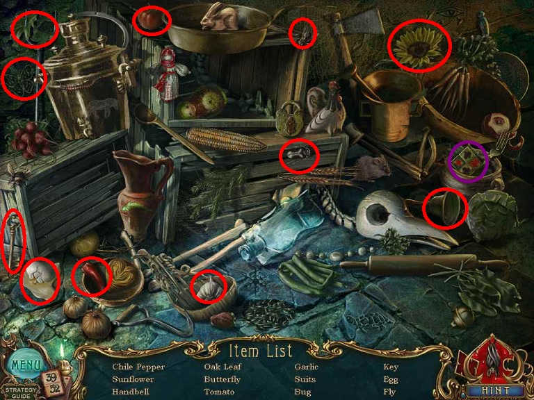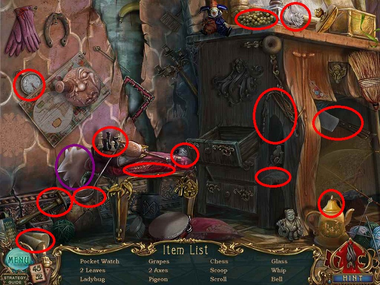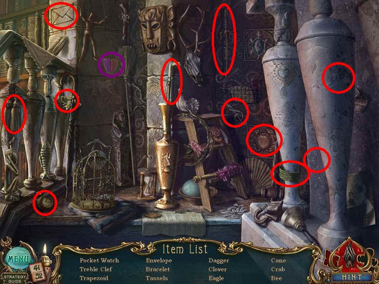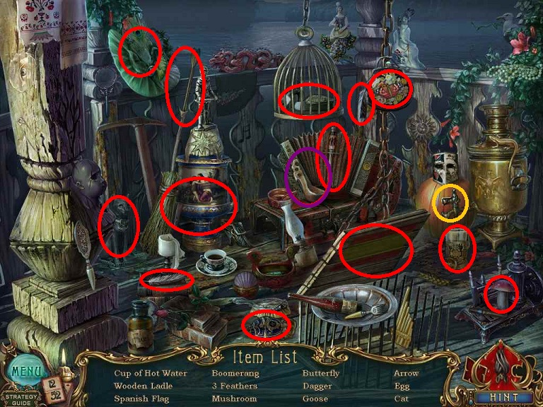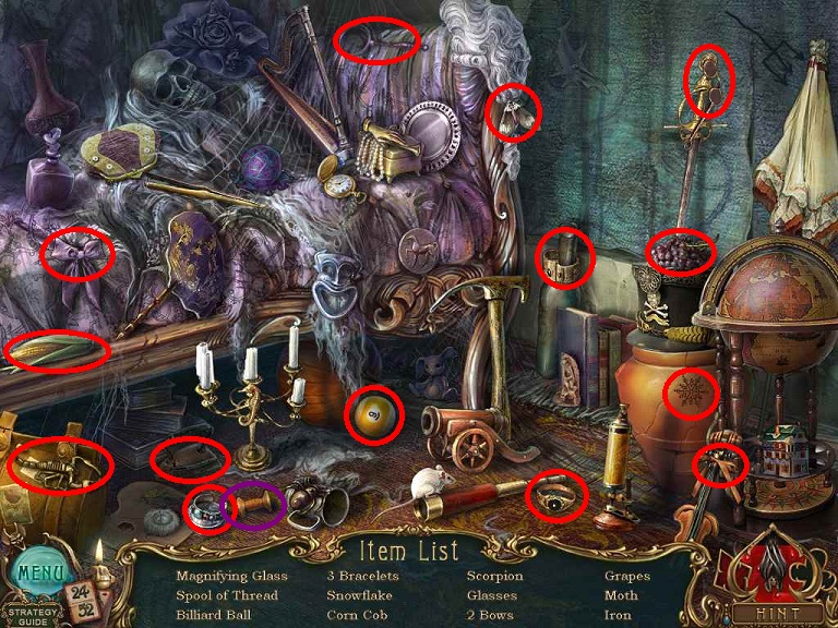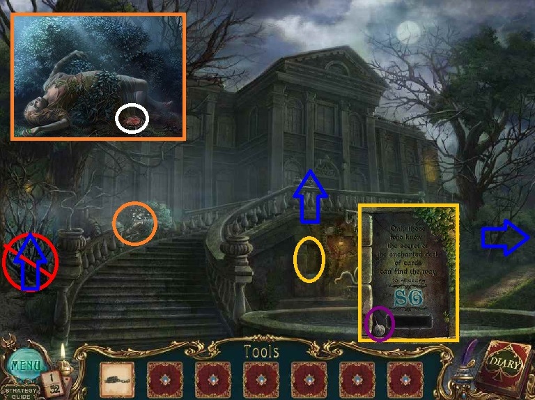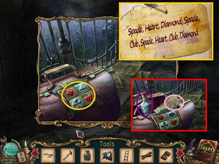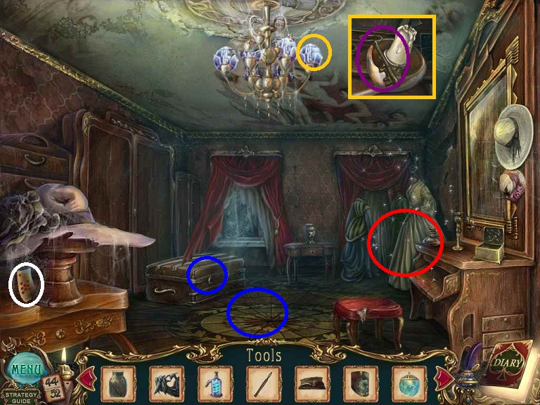 Walkthrough Information: White circles are used for the 52 playing cards and purple circles are items that need to be picked up.