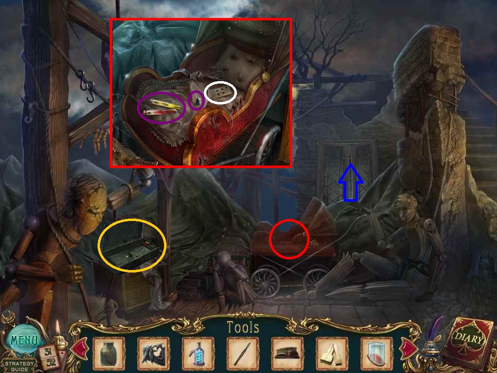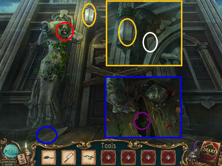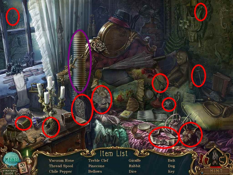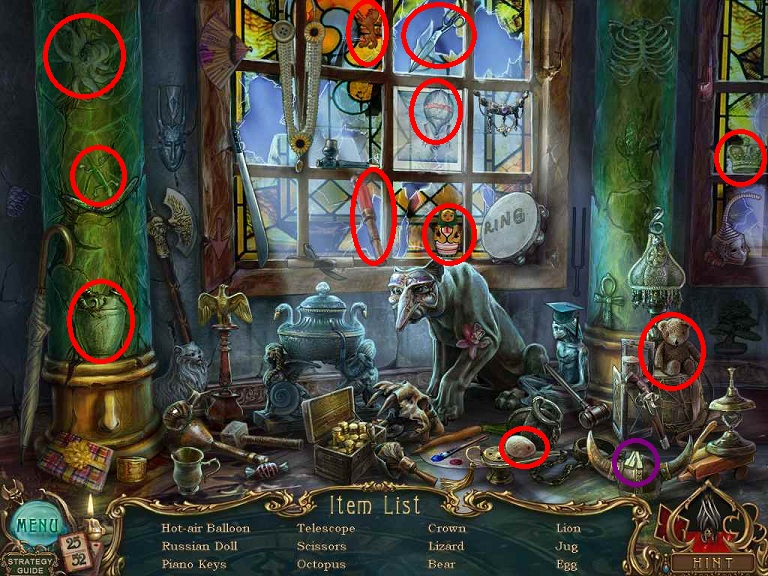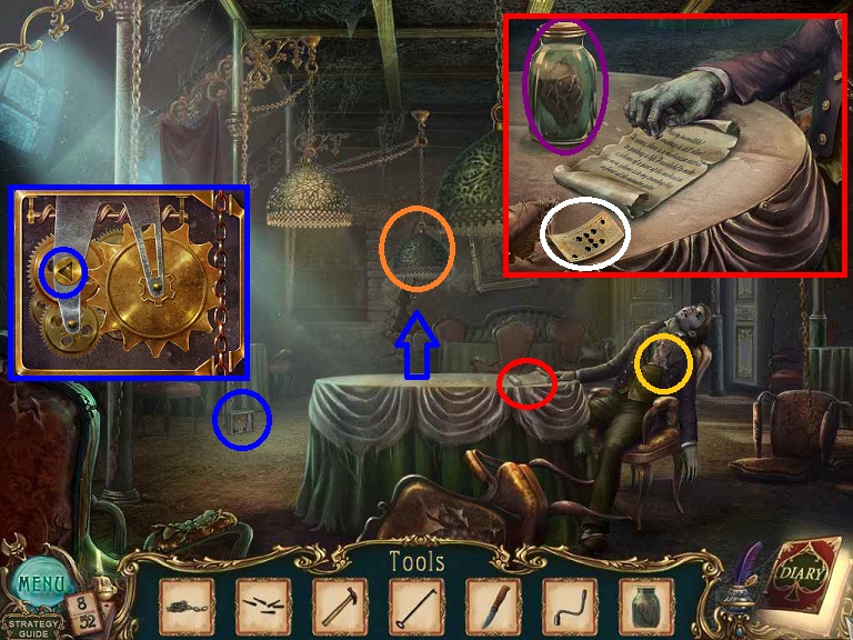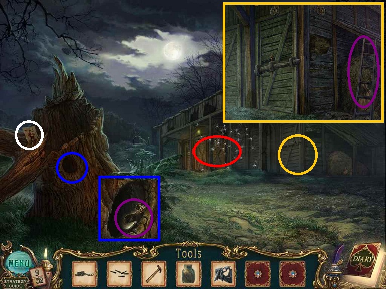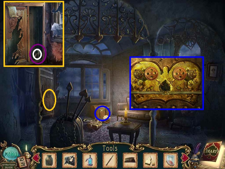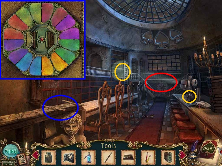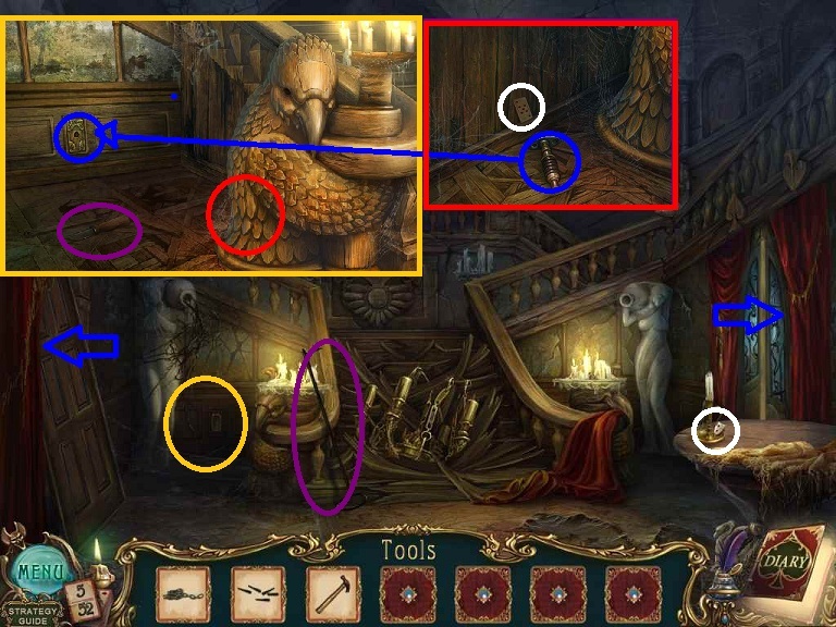 Walkthrough Information: White circles are used for the 52 playing cards and purple circles are items that need to be picked up.