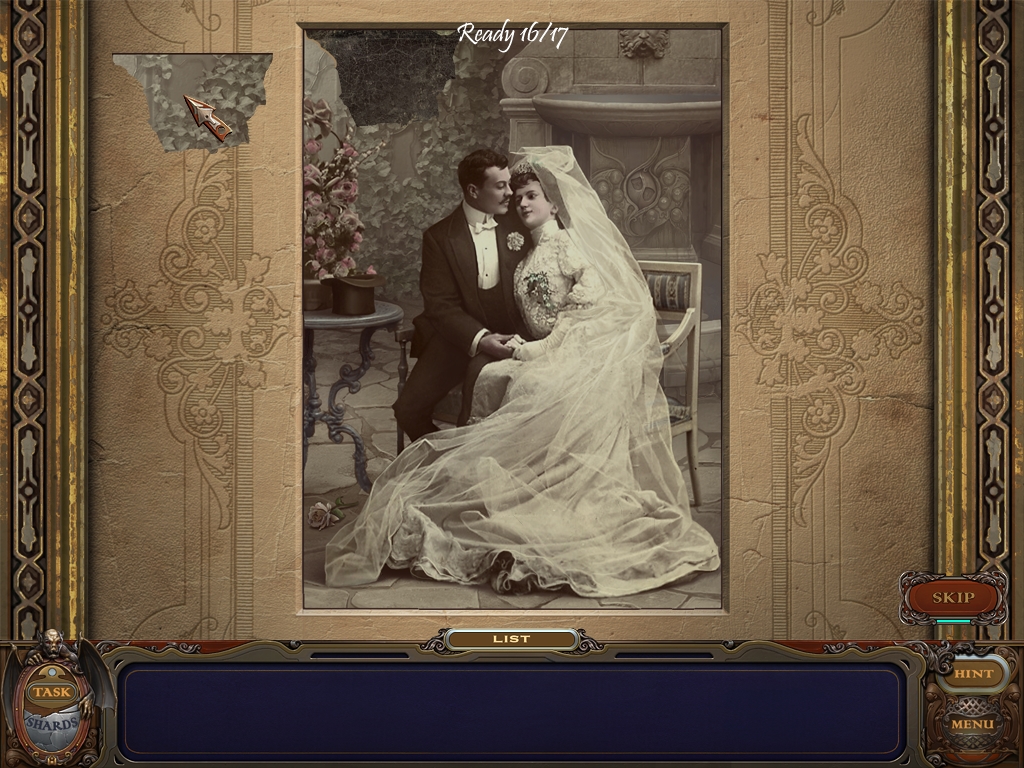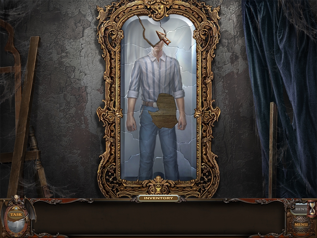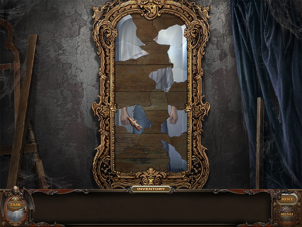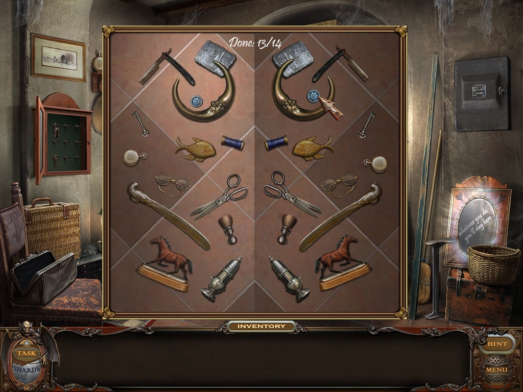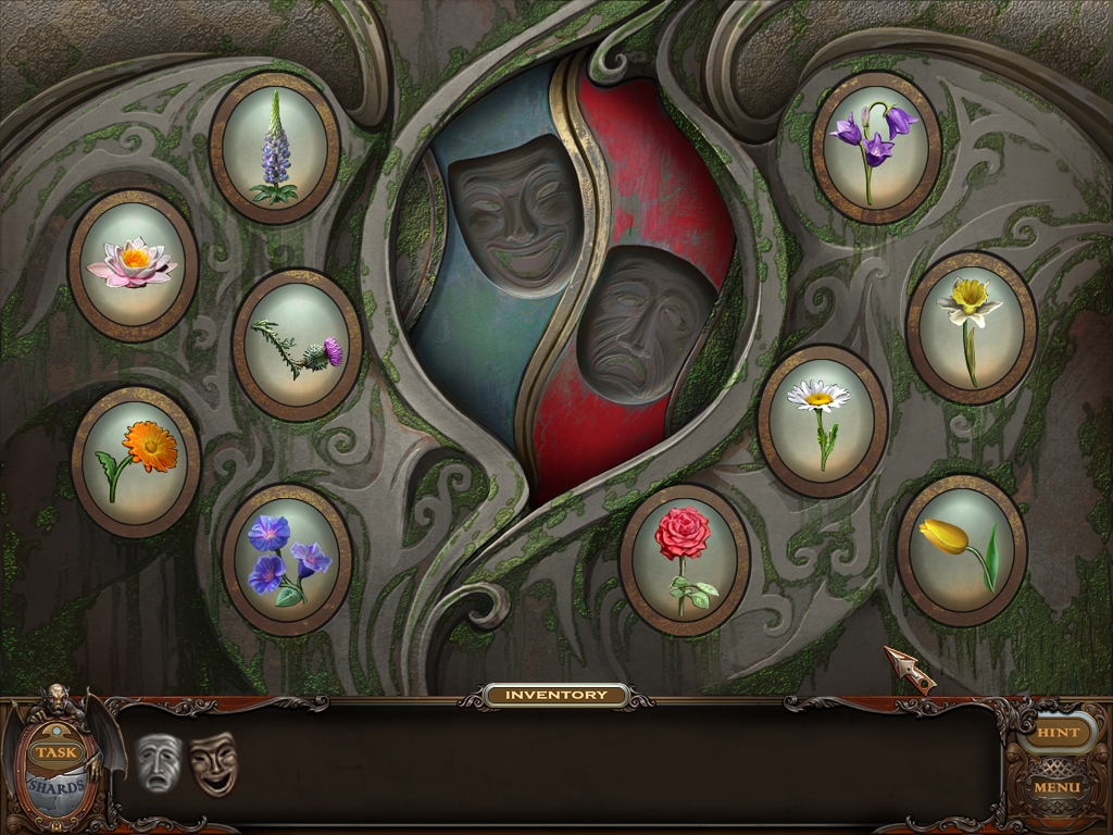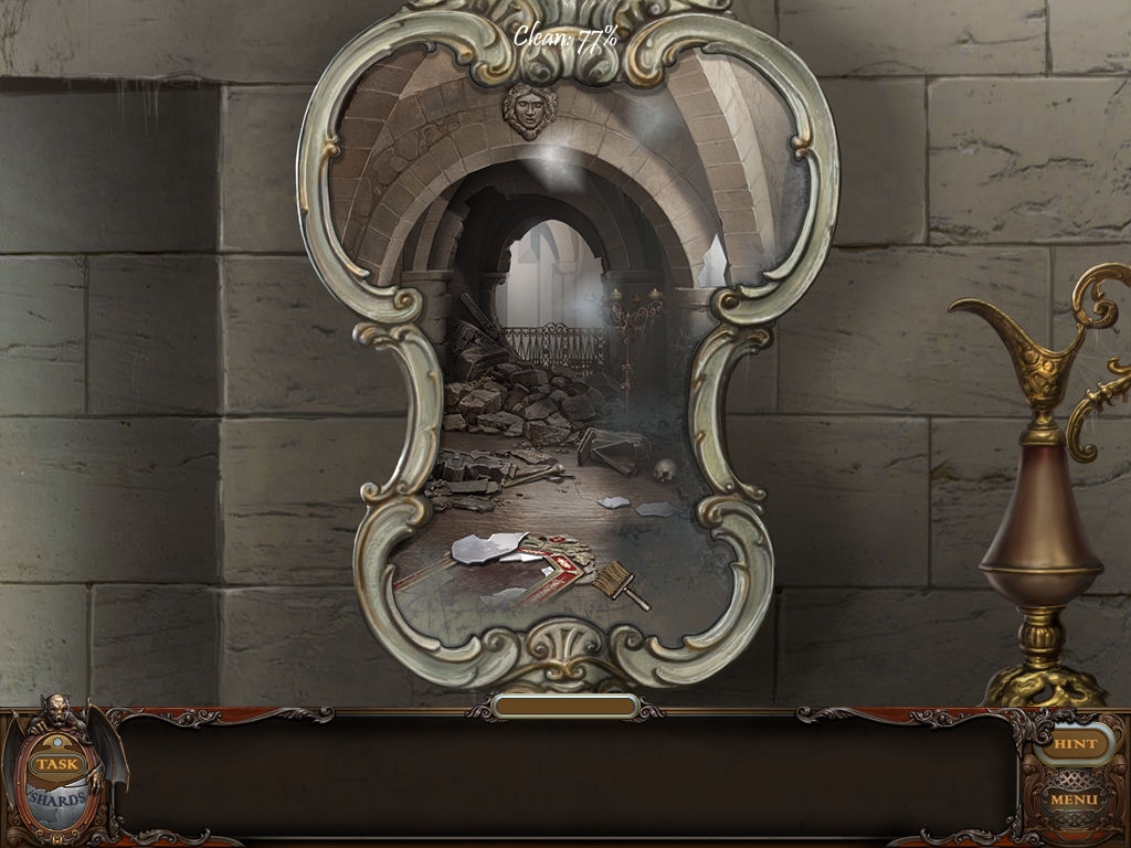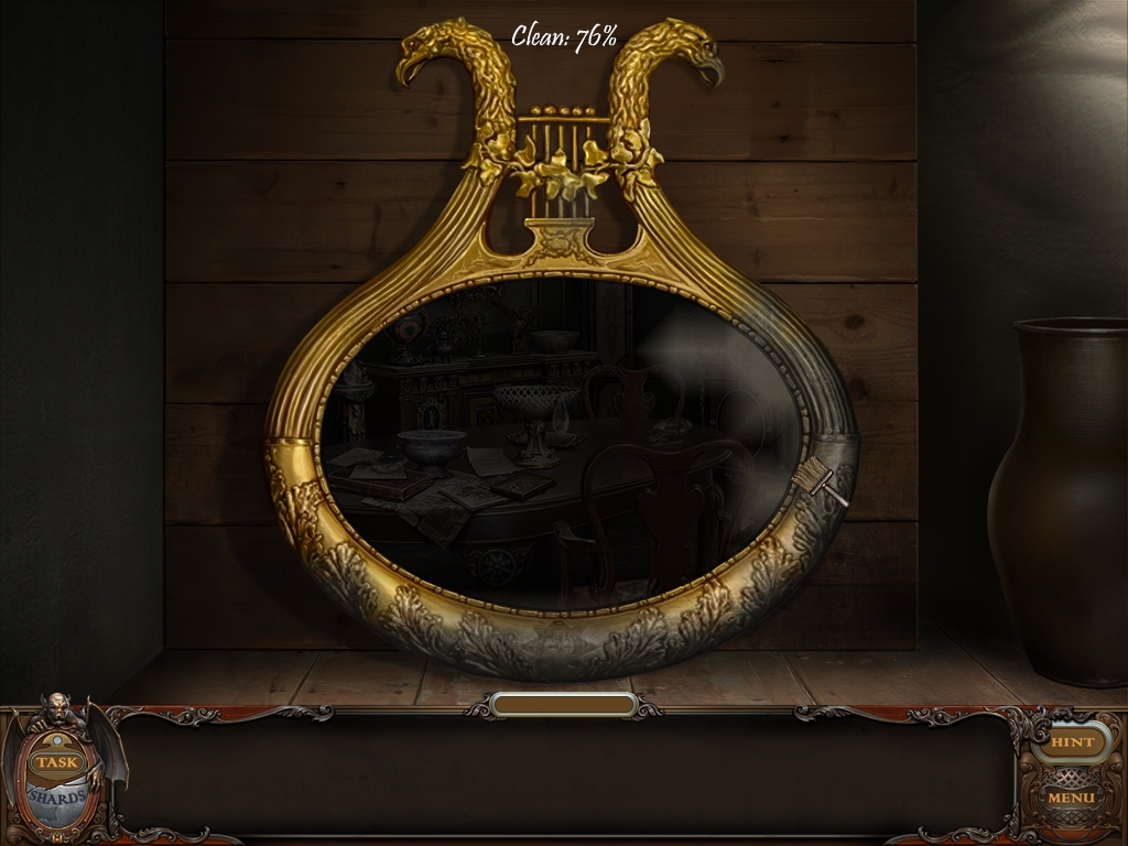 You may monitor your progress and view your current task within the game by viewing the Task button at the lower left hand corner of the screen. Directly beneath the Task button is the Shards button from which you can view your progress in assembling the mirror. Hint and Menu buttons are located at the opposite corner (lower right). Finally, you may keep track of your current inventory or item list in the window located along the bottom of the screen. Use the tab key to switch between the two.