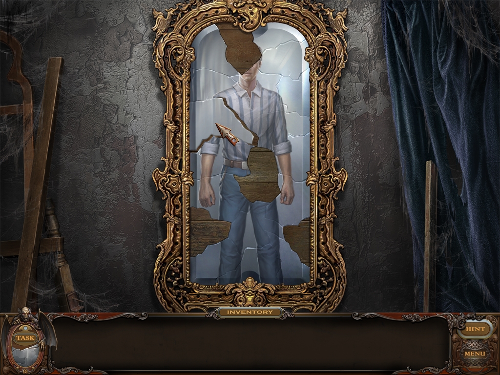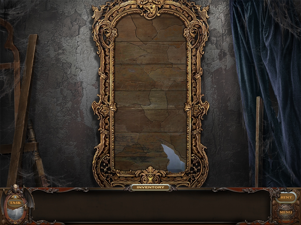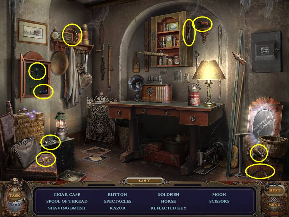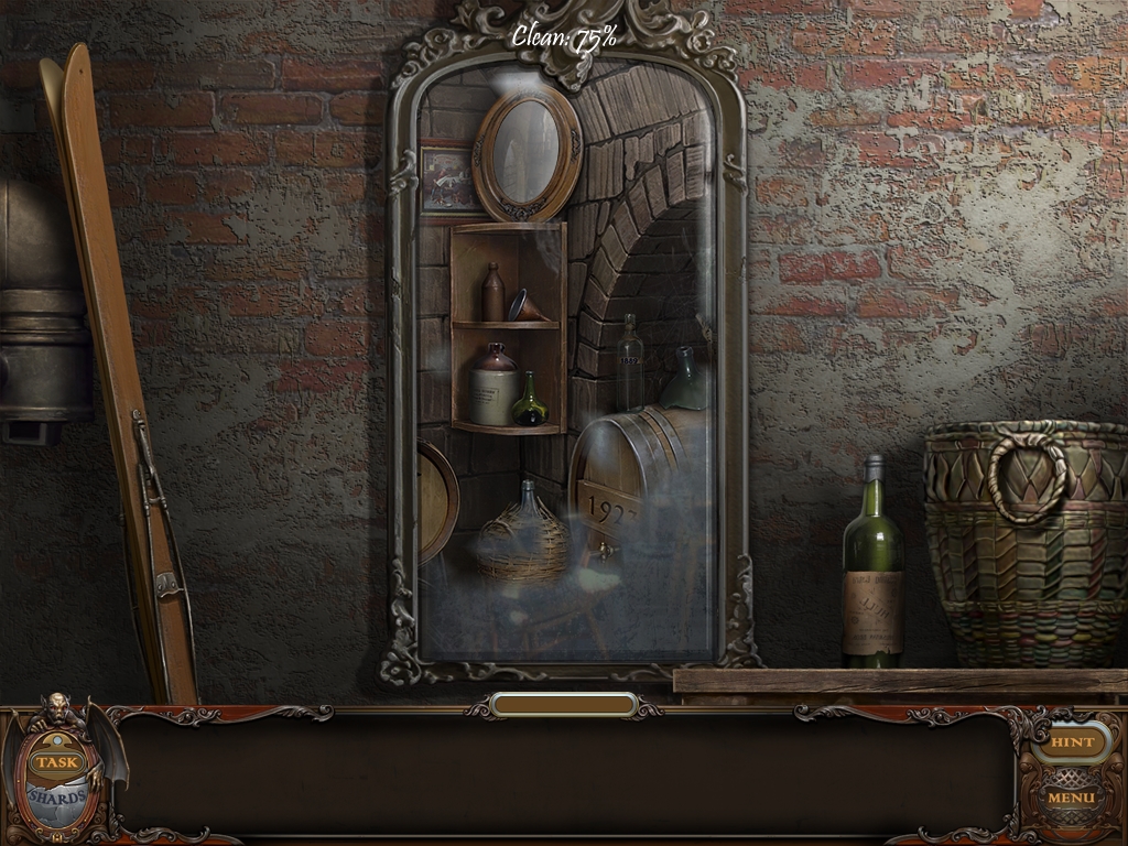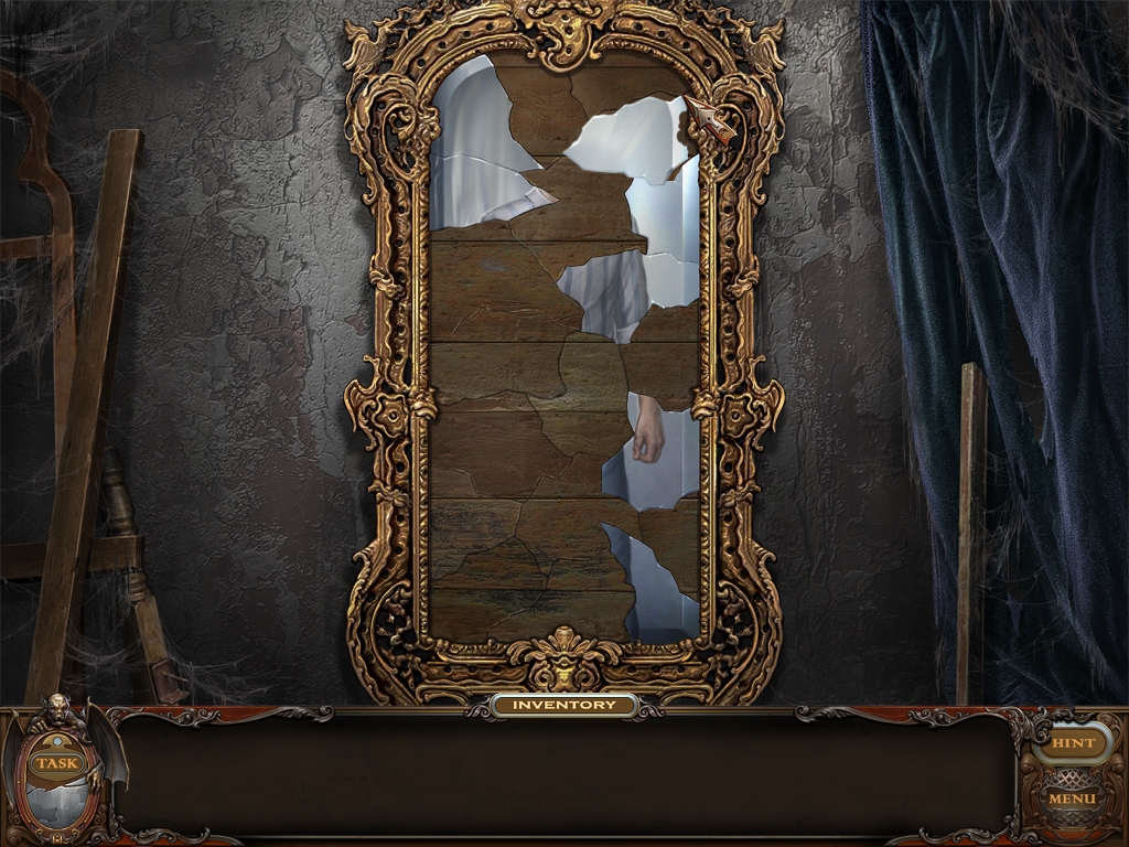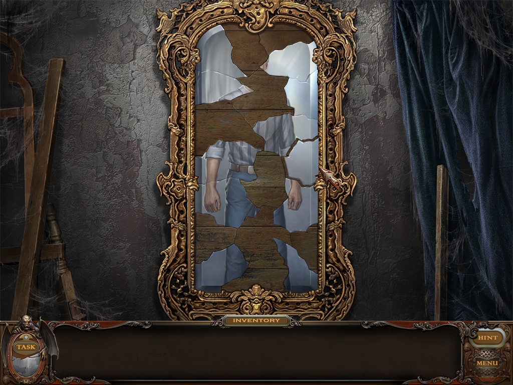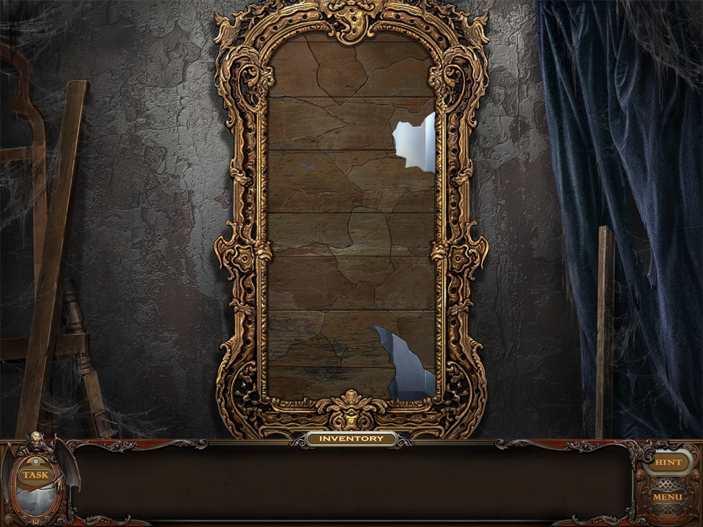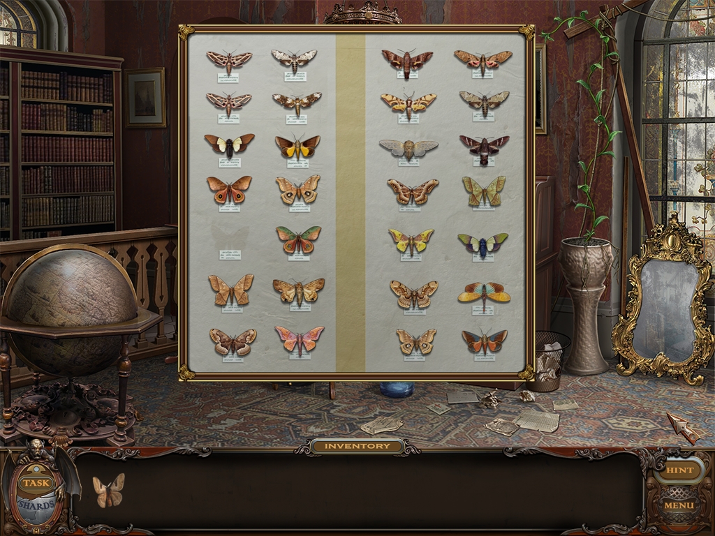 You may monitor your progress and view your current task within the game by viewing the Task button at the lower left hand corner of the screen. Directly beneath the Task button is the Shards button from which you can view your progress in assembling the mirror. Hint and Menu buttons are located at the opposite corner (lower right). Finally, you may keep track of your current inventory or item list in the window located along the bottom of the screen. Use the tab key to switch between the two.