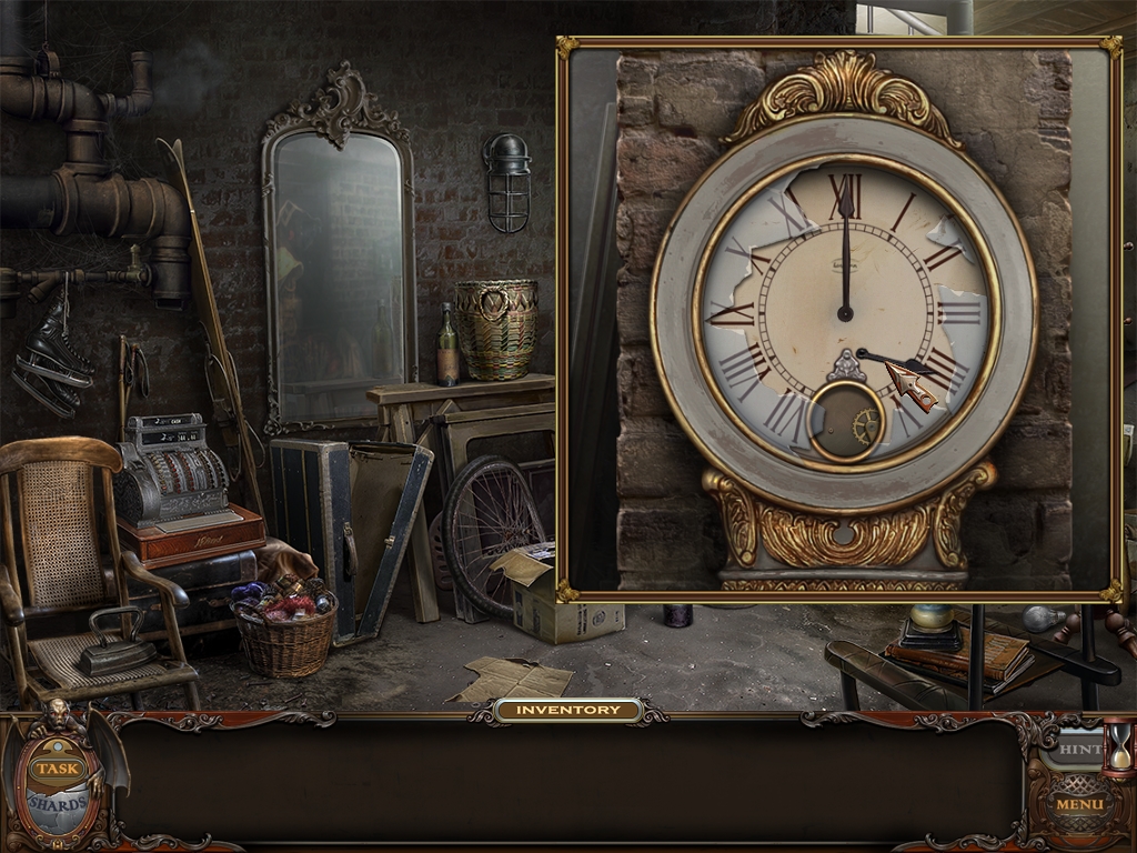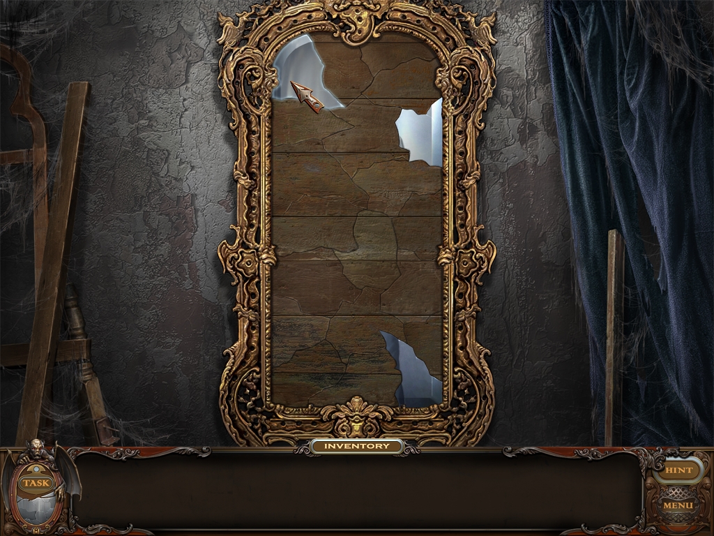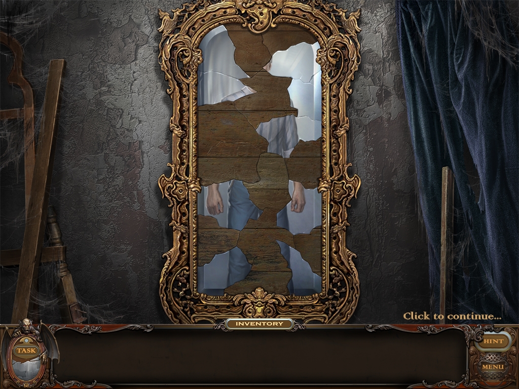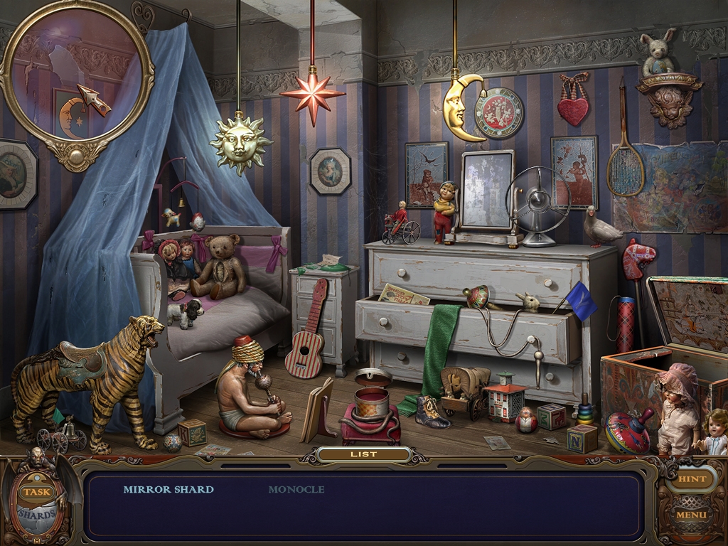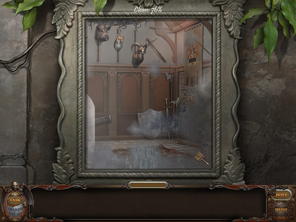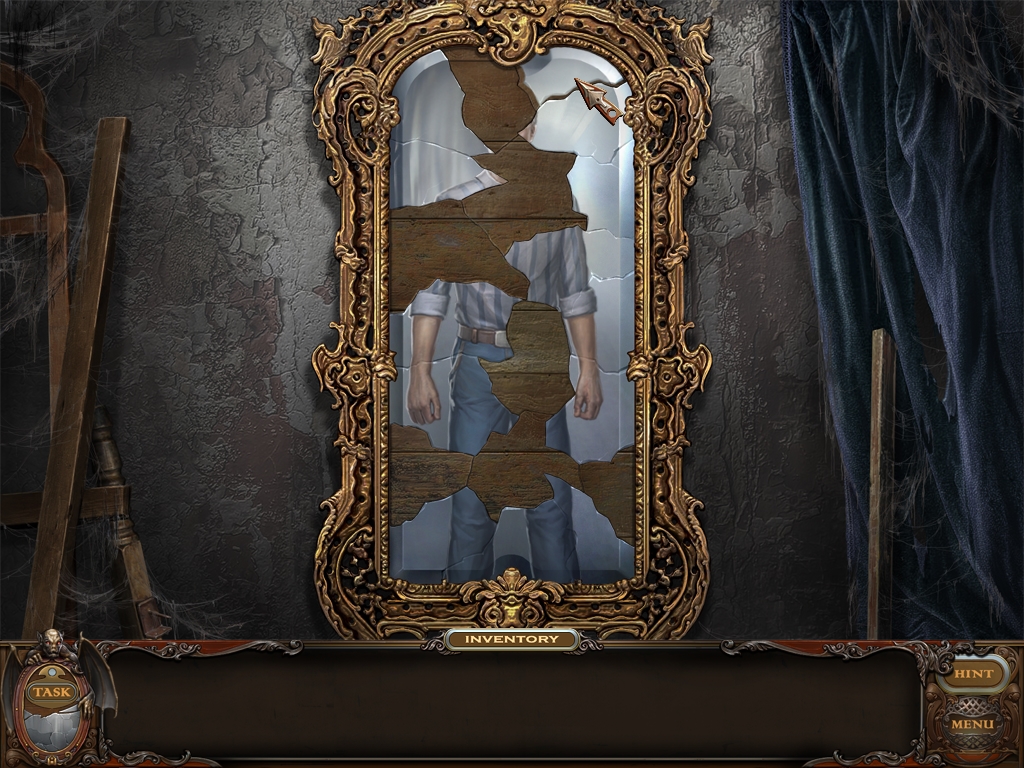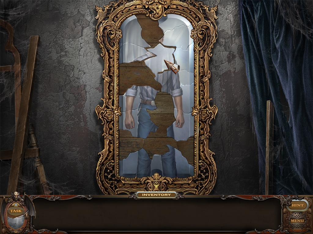 You may monitor your progress and view your current task within the game by viewing the Task button at the lower left hand corner of the screen. Directly beneath the Task button is the Shards button from which you can view your progress in assembling the mirror. Hint and Menu buttons are located at the opposite corner (lower right). Finally, you may keep track of your current inventory or item list in the window located along the bottom of the screen. Use the tab key to switch between the two.