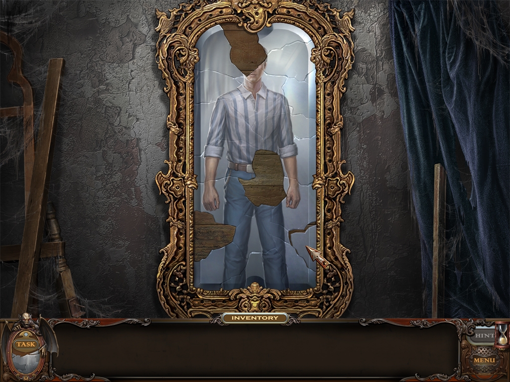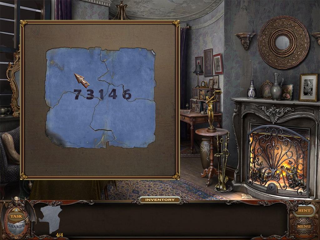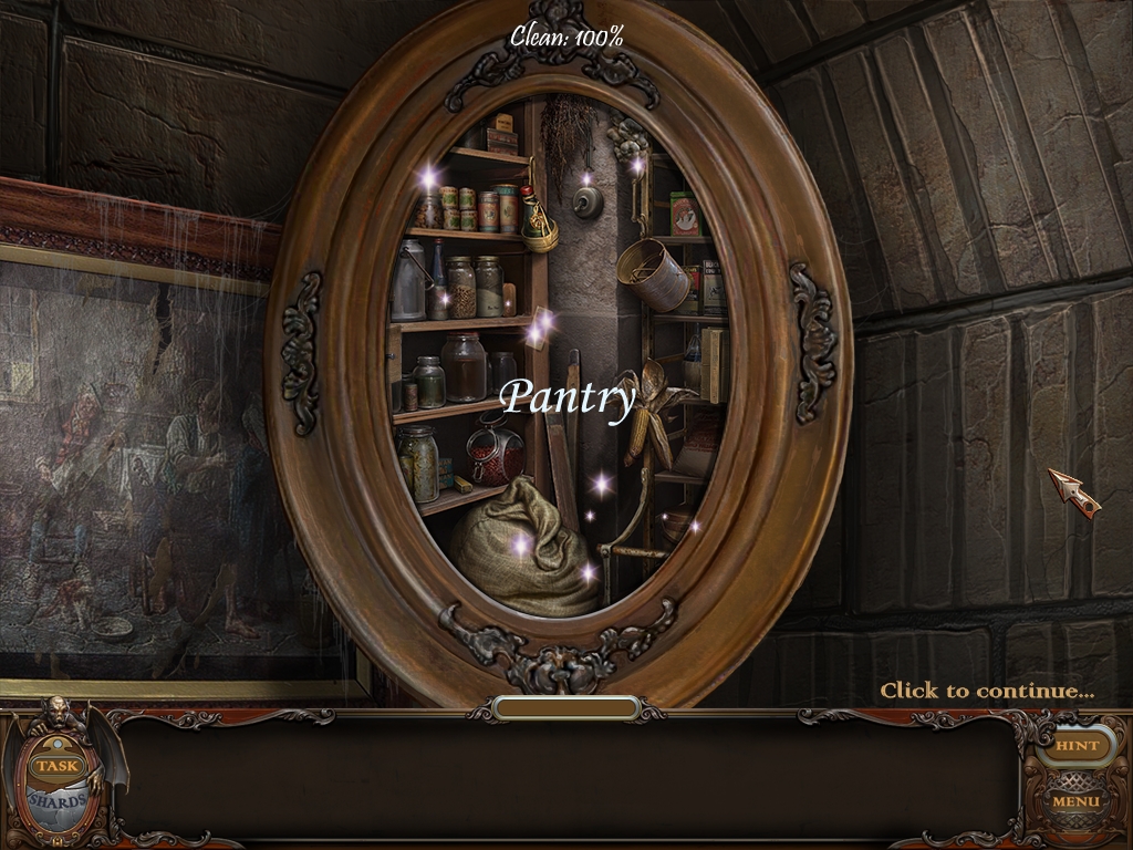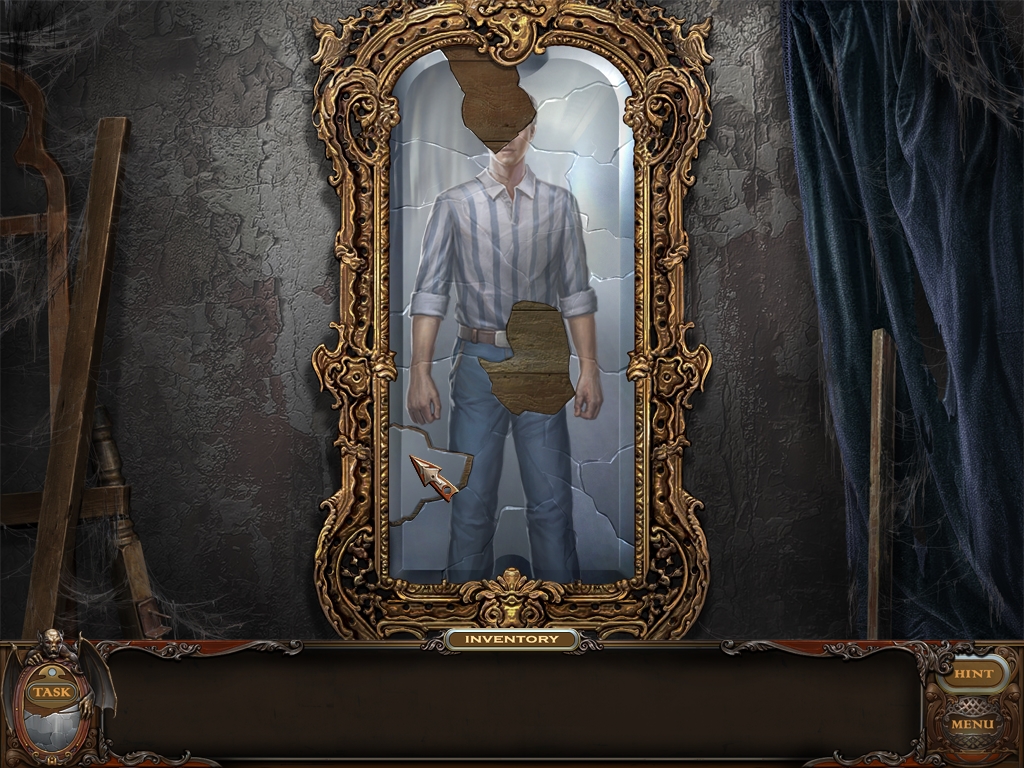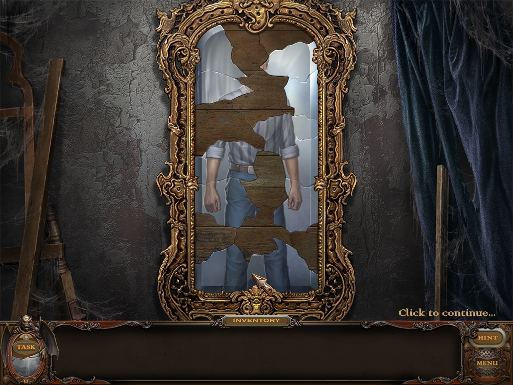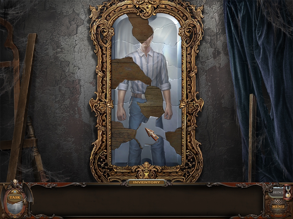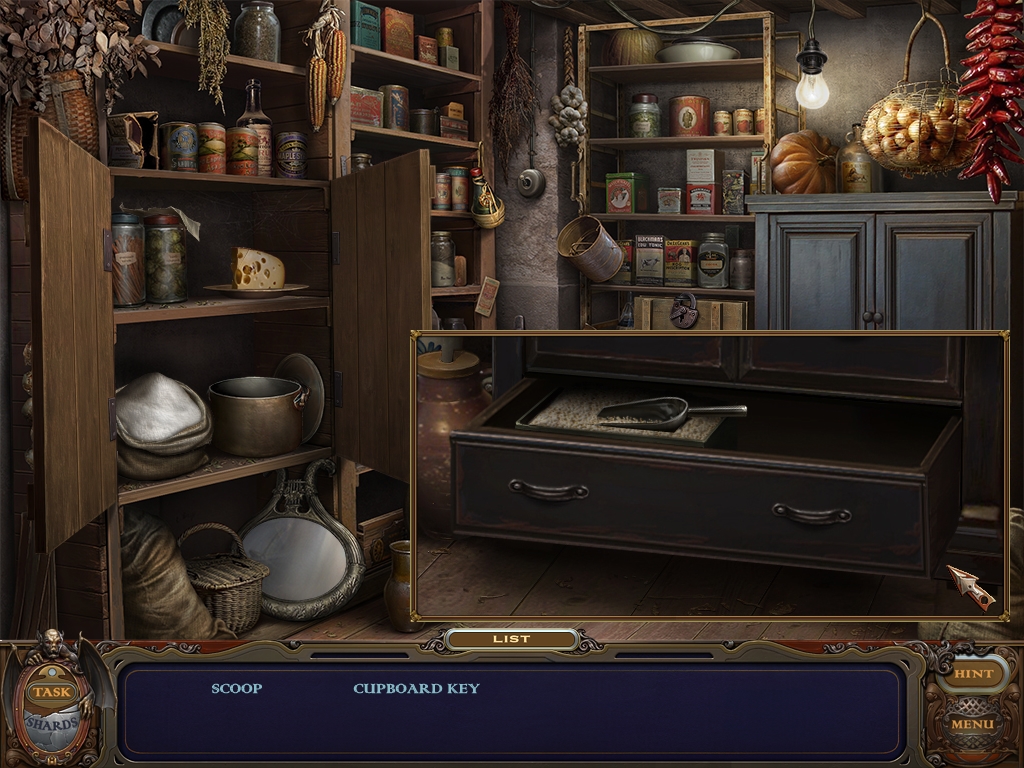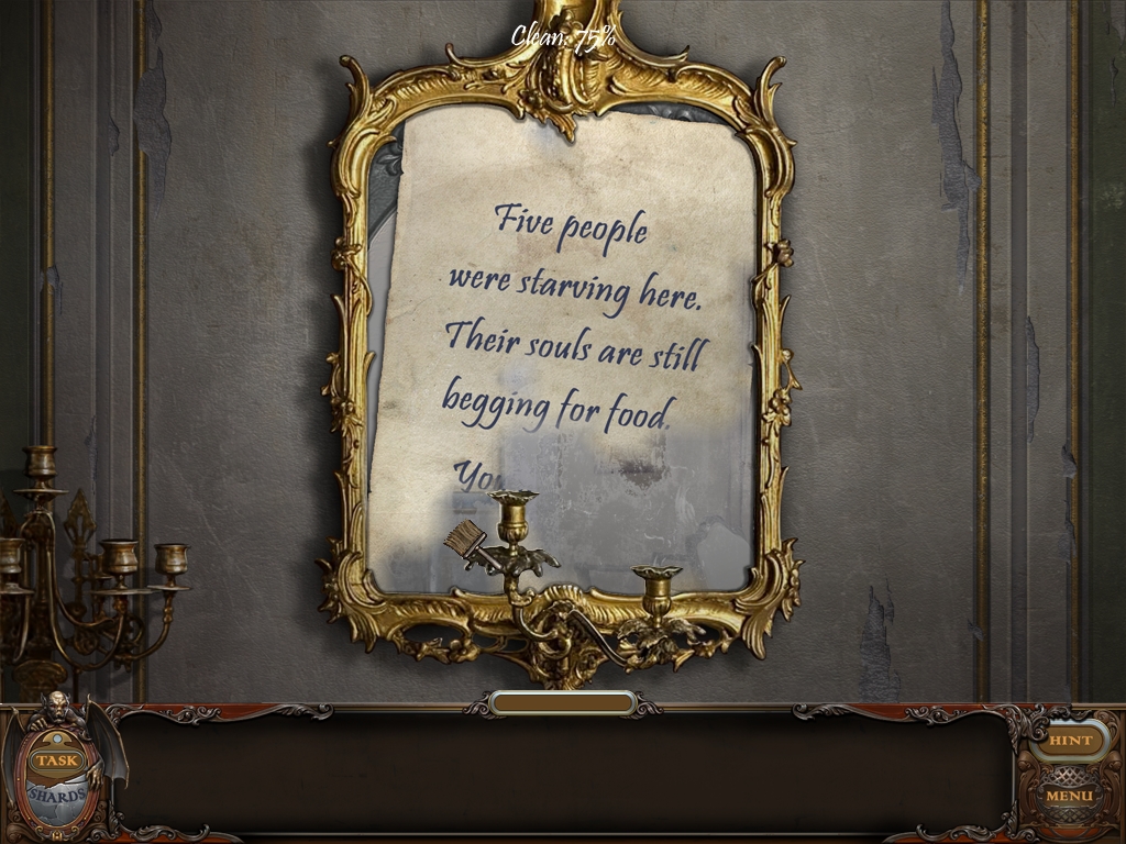 You may monitor your progress and view your current task within the game by viewing the Task button at the lower left hand corner of the screen. Directly beneath the Task button is the Shards button from which you can view your progress in assembling the mirror. Hint and Menu buttons are located at the opposite corner (lower right). Finally, you may keep track of your current inventory or item list in the window located along the bottom of the screen. Use the tab key to switch between the two.