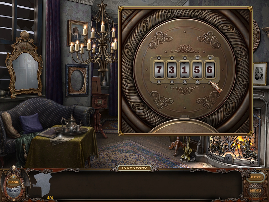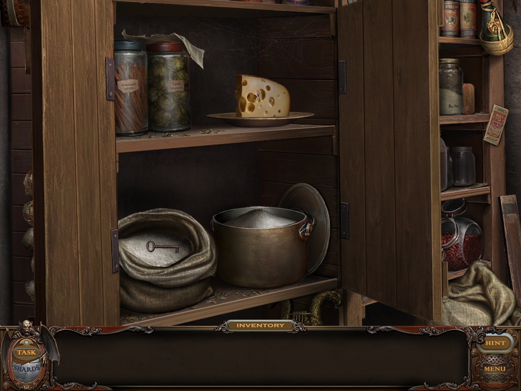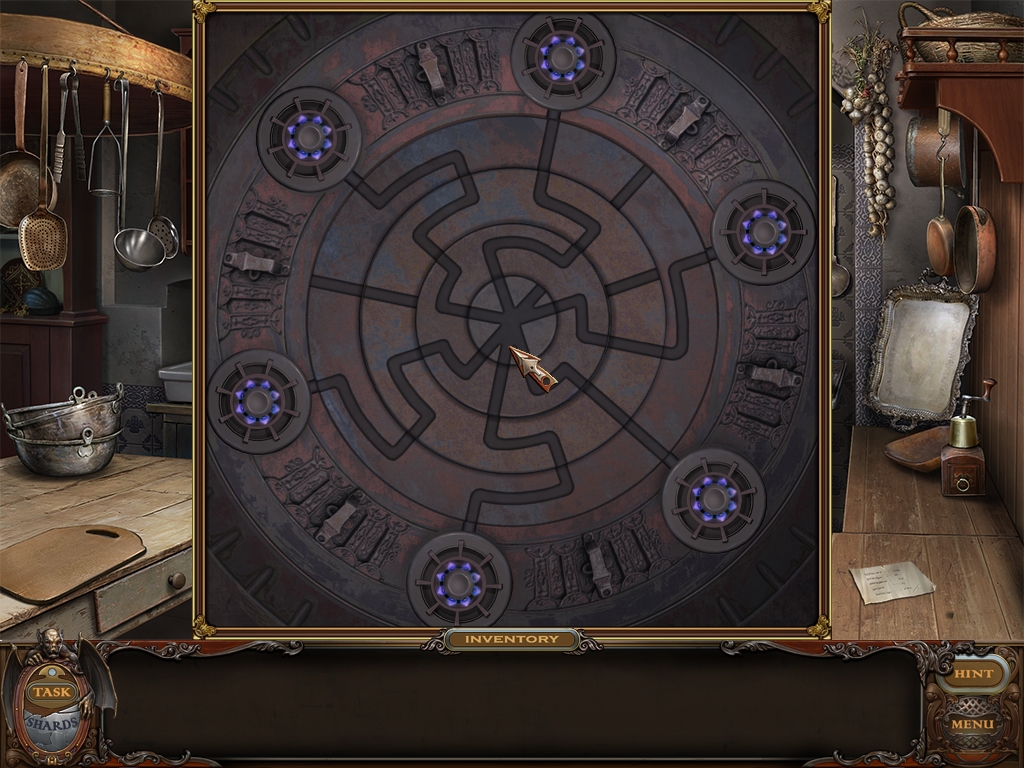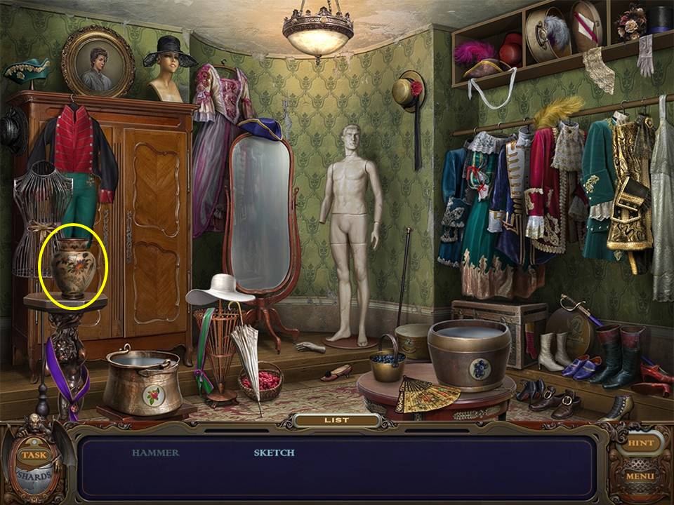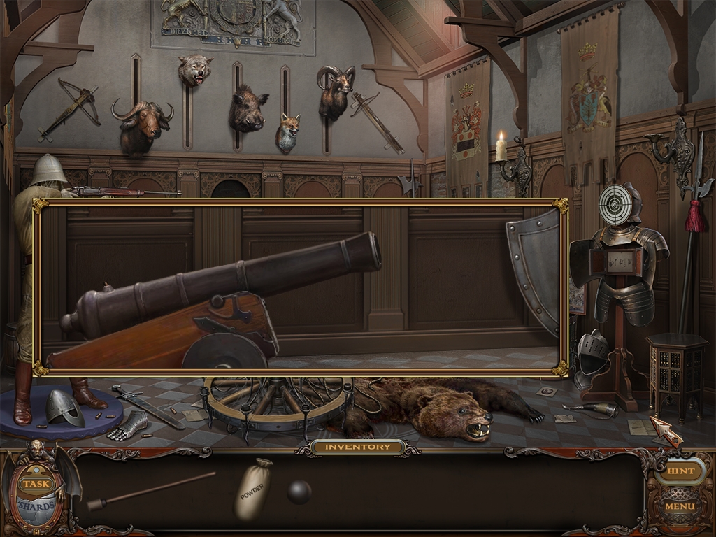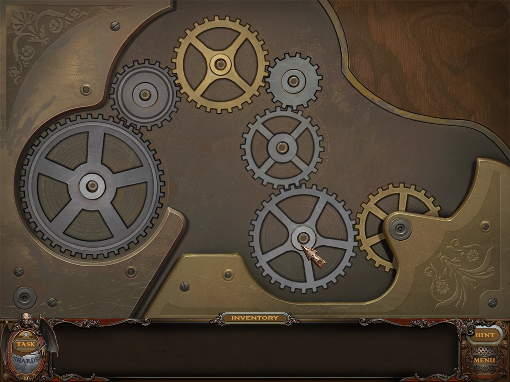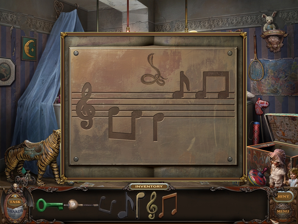 You may monitor your progress and view your current task within the game by viewing the Task button at the lower left hand corner of the screen. Directly beneath the Task button is the Shards button from which you can view your progress in assembling the mirror. Hint and Menu buttons are located at the opposite corner (lower right). Finally, you may keep track of your current inventory or item list in the window located along the bottom of the screen. Use the tab key to switch between the two.