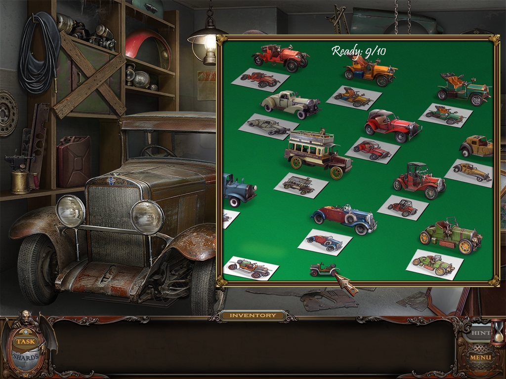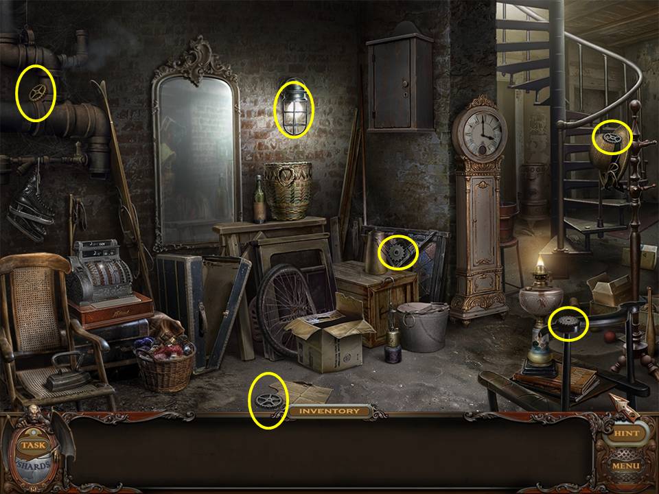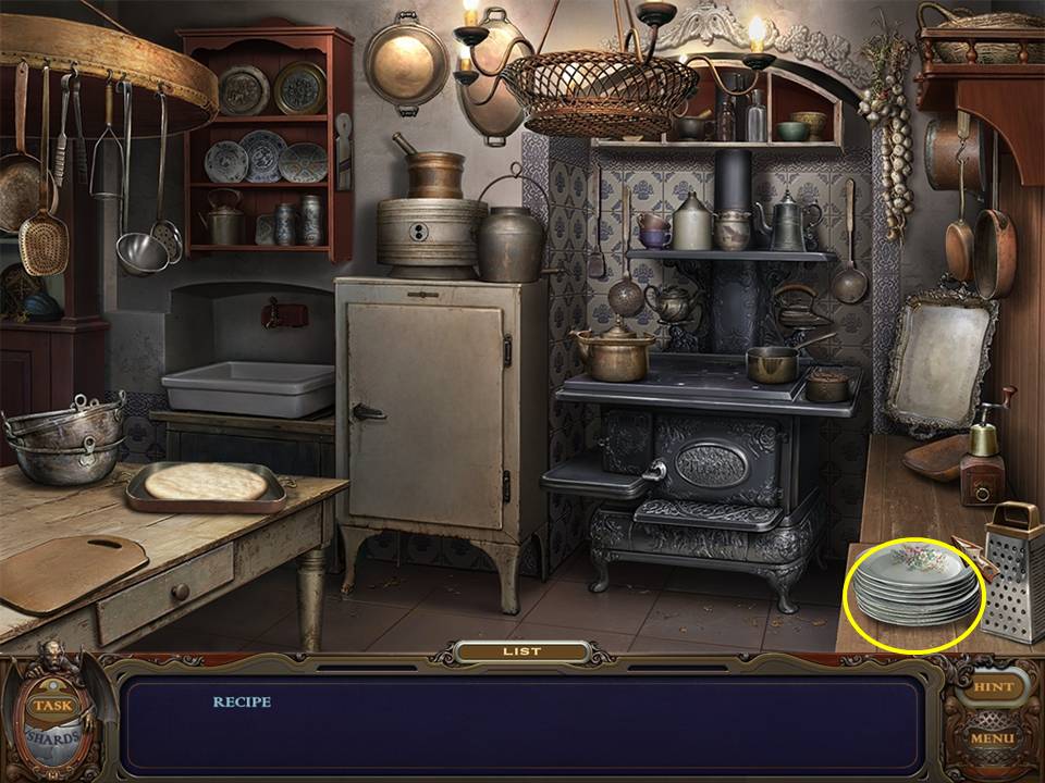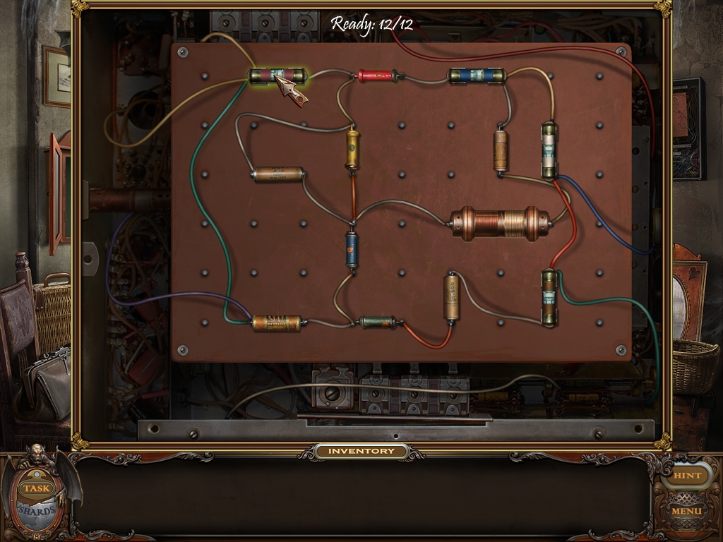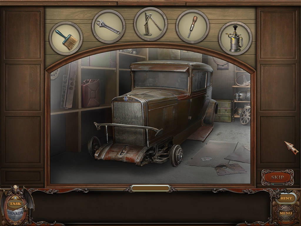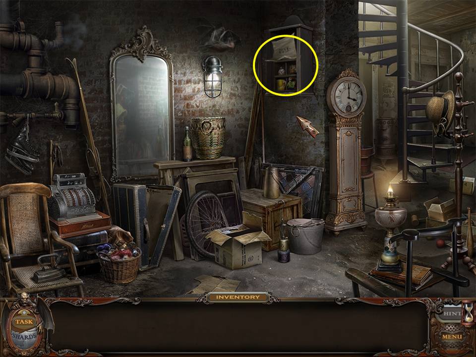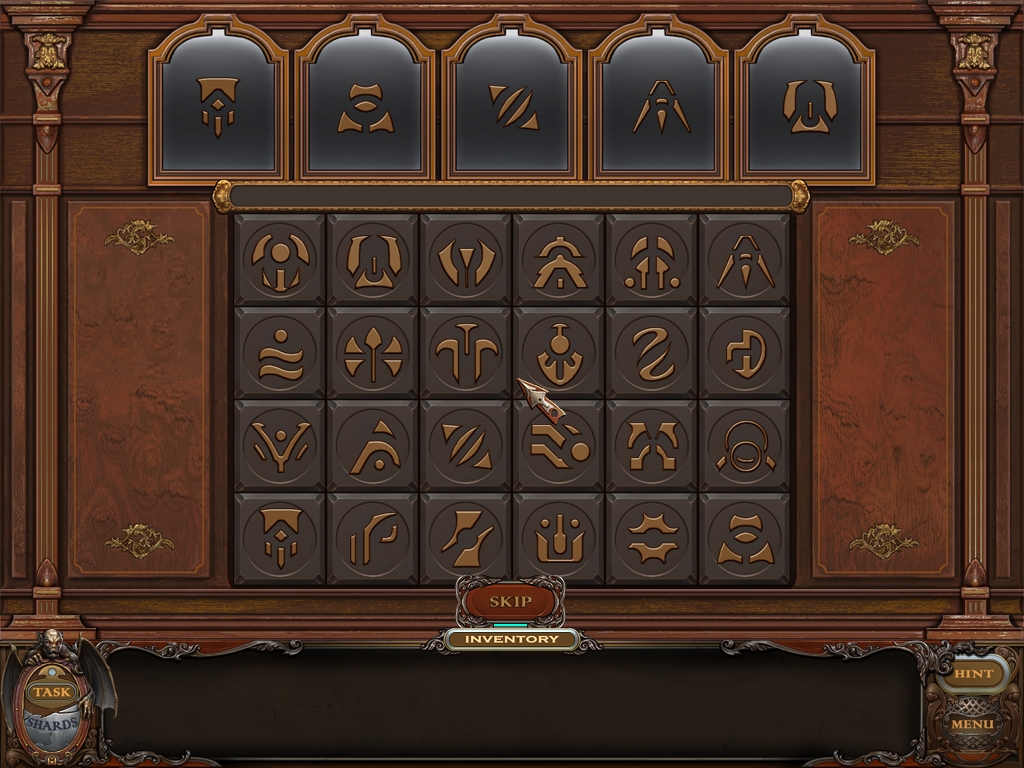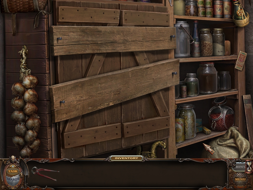 You may monitor your progress and view your current task within the game by viewing the Task button at the lower left hand corner of the screen. Directly beneath the Task button is the Shards button from which you can view your progress in assembling the mirror. Hint and Menu buttons are located at the opposite corner (lower right). Finally, you may keep track of your current inventory or item list in the window located along the bottom of the screen. Use the tab key to switch between the two.