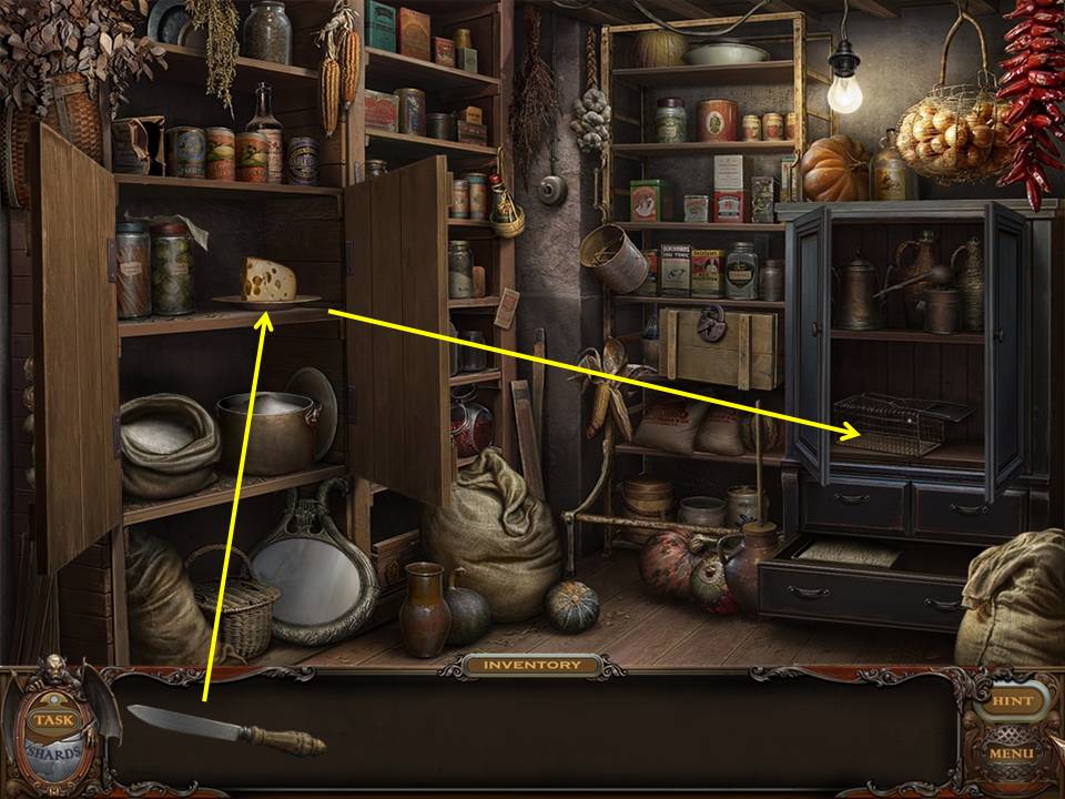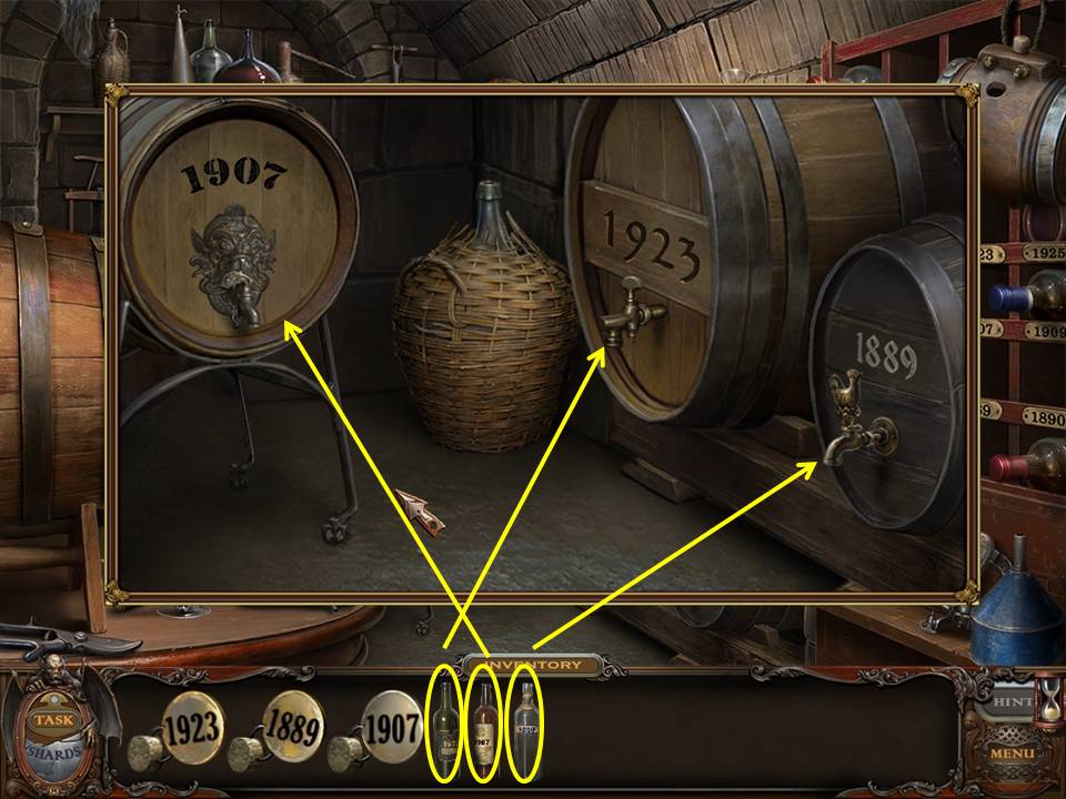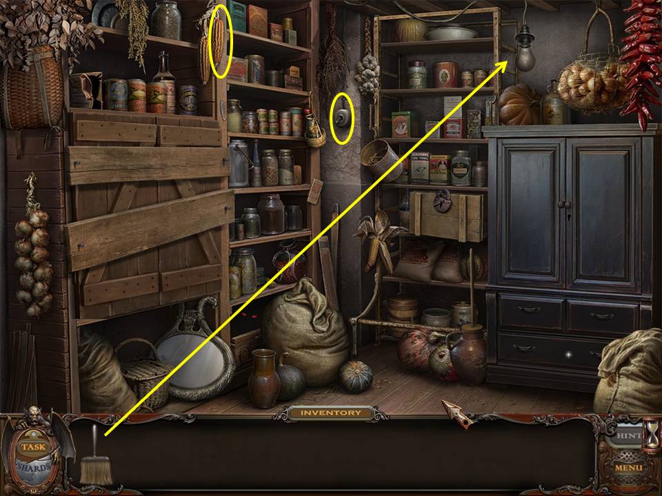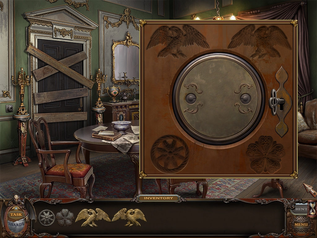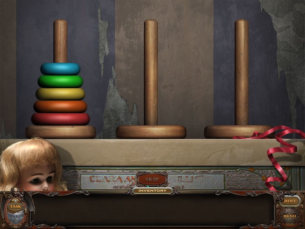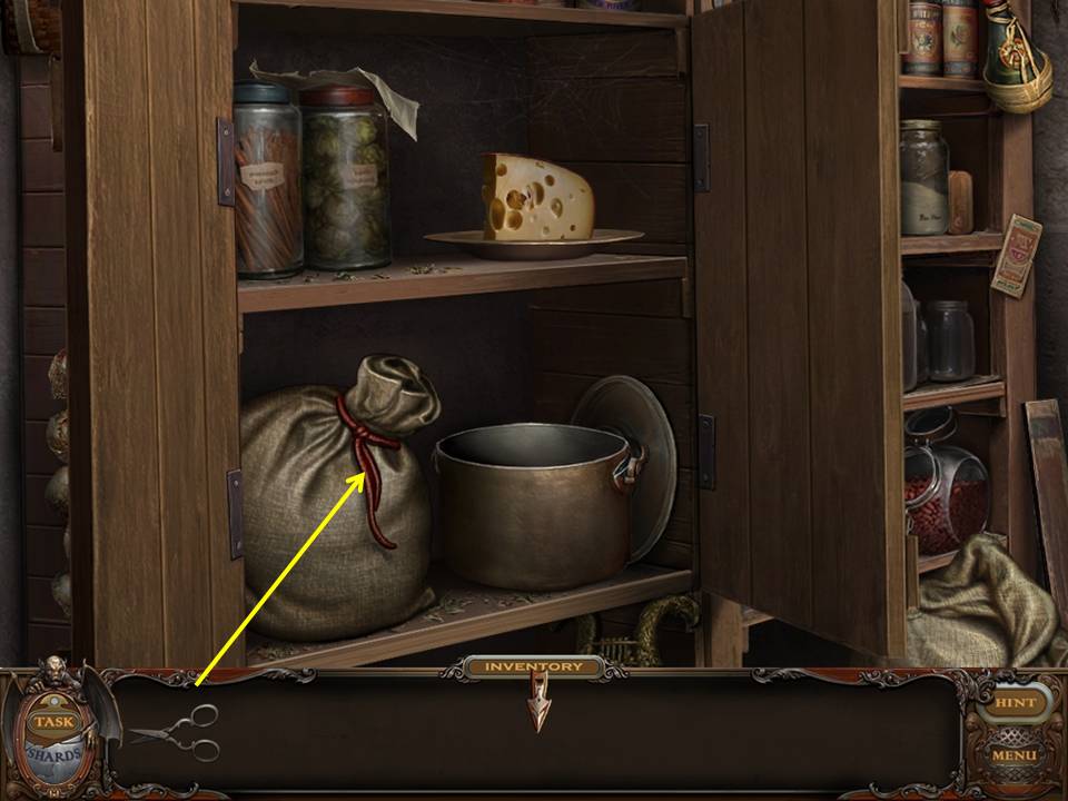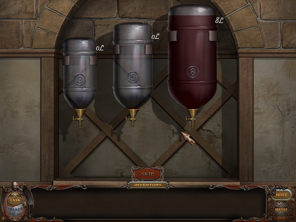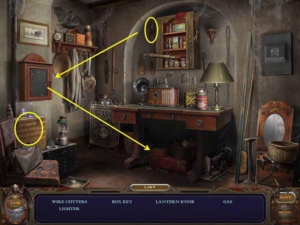 You may monitor your progress and view your current task within the game by viewing the Task button at the lower left hand corner of the screen. Directly beneath the Task button is the Shards button from which you can view your progress in assembling the mirror. Hint and Menu buttons are located at the opposite corner (lower right). Finally, you may keep track of your current inventory or item list in the window located along the bottom of the screen. Use the tab key to switch between the two.
