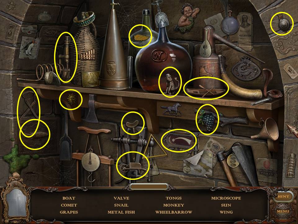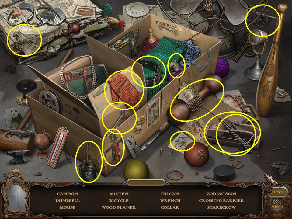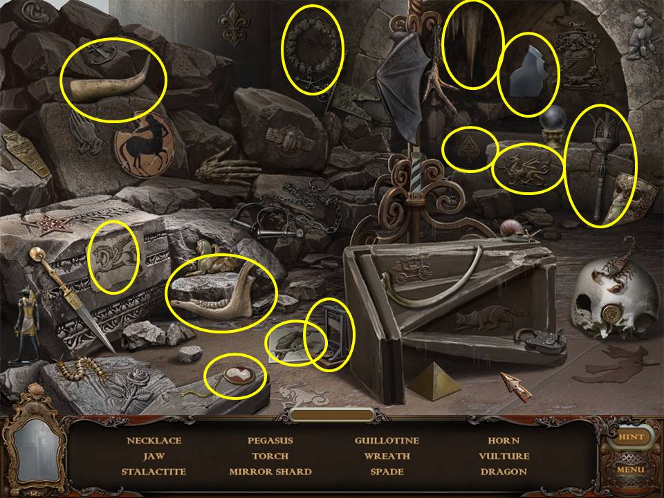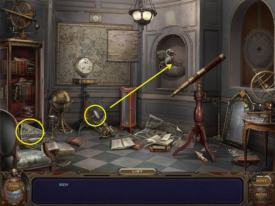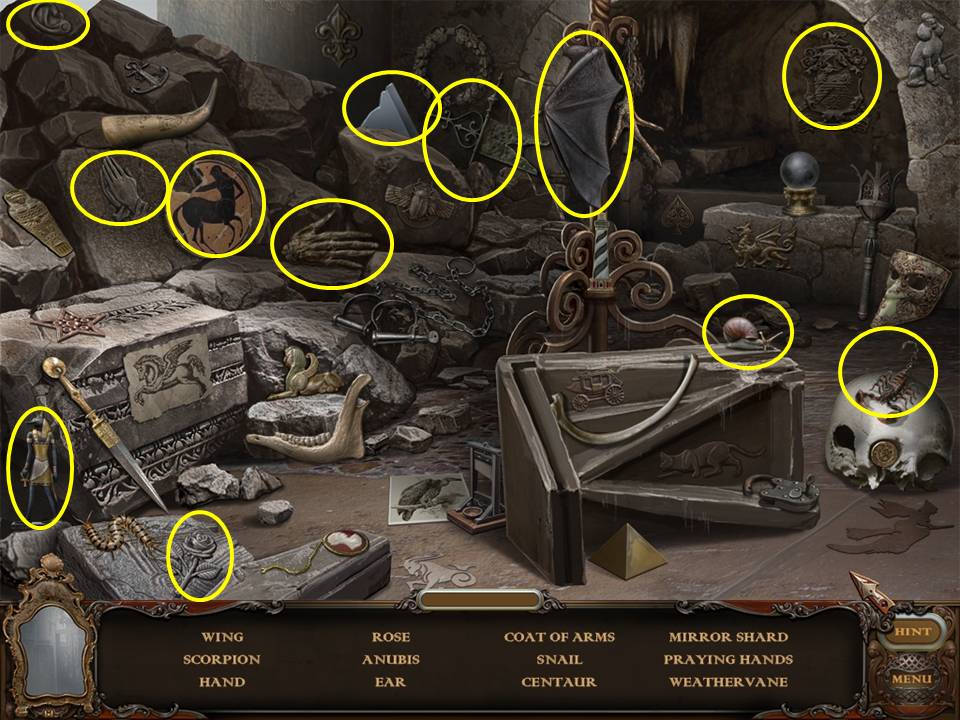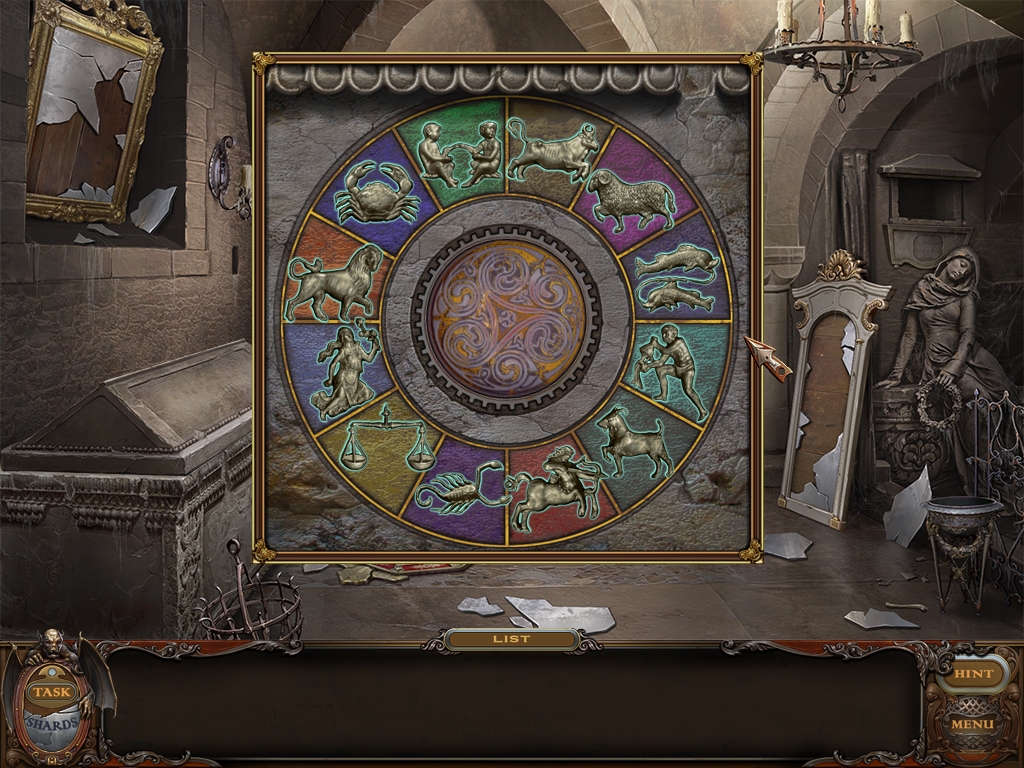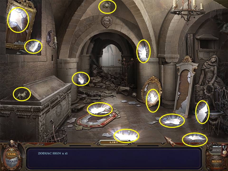 Return to the Sarcophagus to discover 10 glowing shards. Each will take you back to a Hidden Object Area where you will find the items listed as well as 10 of 12 ZODIAC SIGNS. Don't forget that the Sarcophagus area itself contains your first two ZODIAC SIGNS (Cancer and Leo). You may click on the shards and play the resulting Hidden Object Areas in any order you desire.
