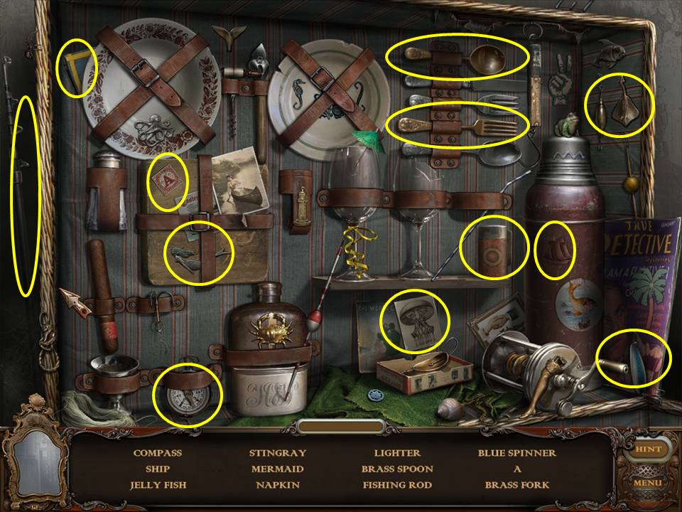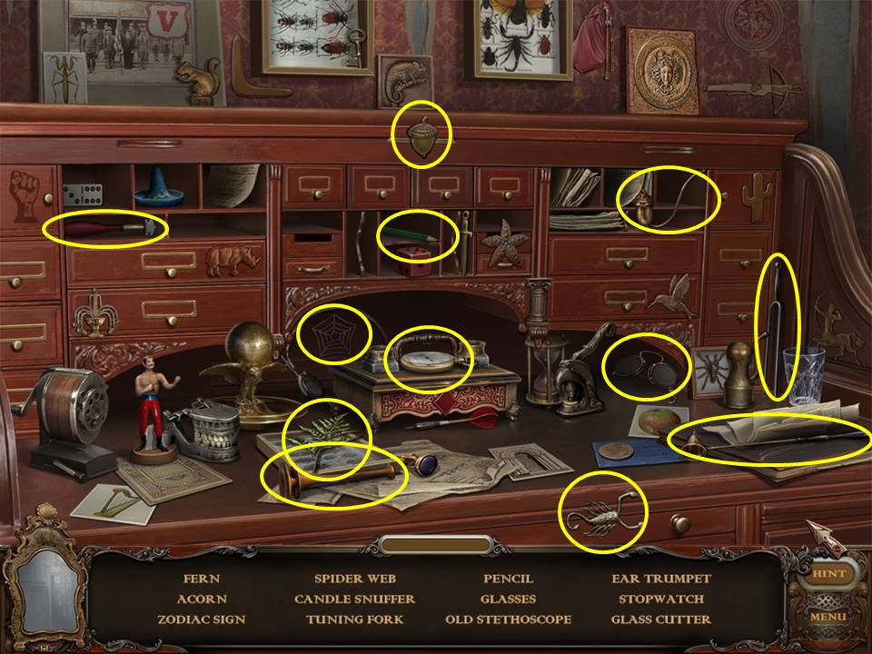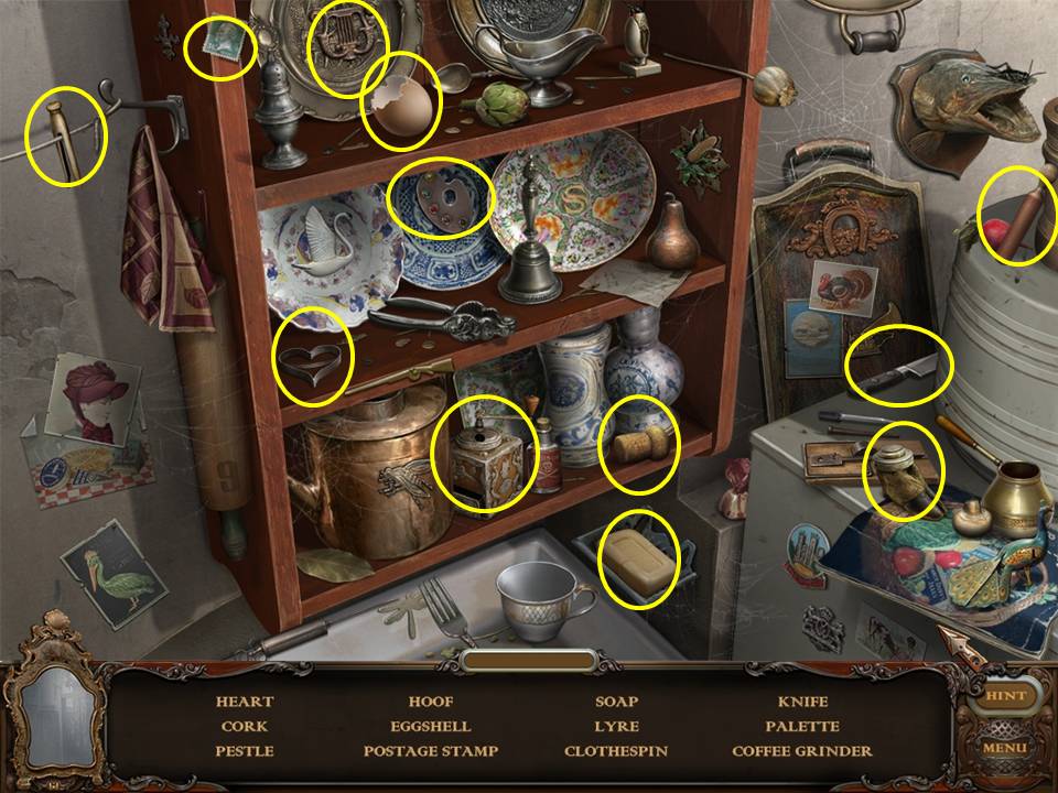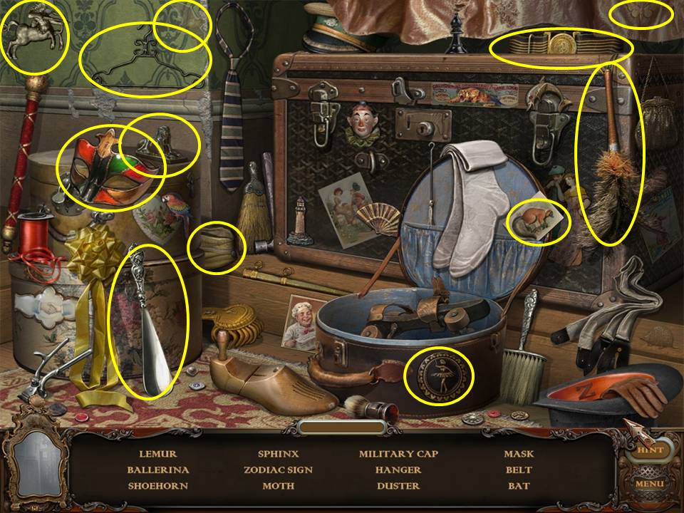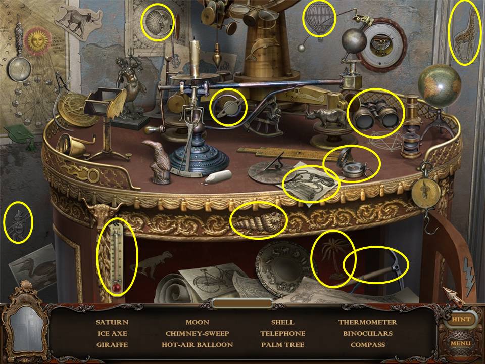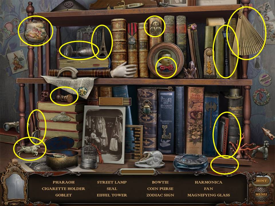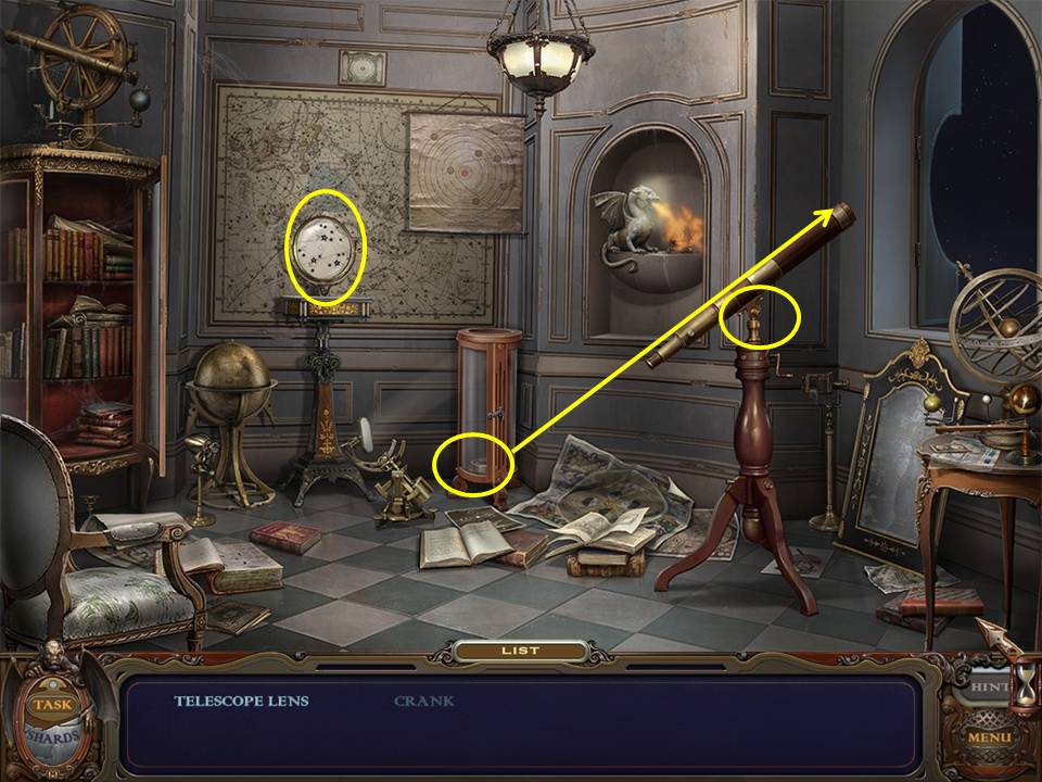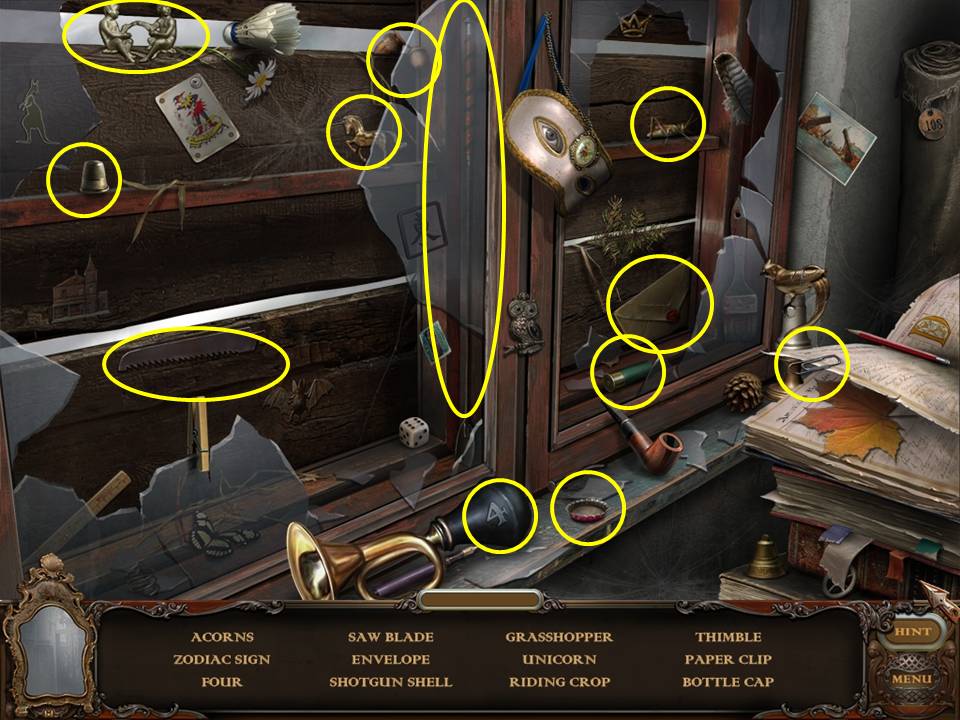Return to the Sarcophagus to discover 10 glowing shards. Each will take you back to a Hidden Object Area where you will find the items listed as well as 10 of 12 ZODIAC SIGNS. Don't forget that the Sarcophagus area itself contains your first two ZODIAC SIGNS (Cancer and Leo). You may click on the shards and play the resulting Hidden Object Areas in any order you desire.