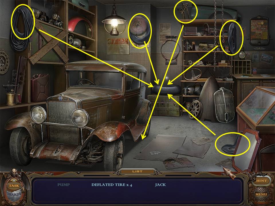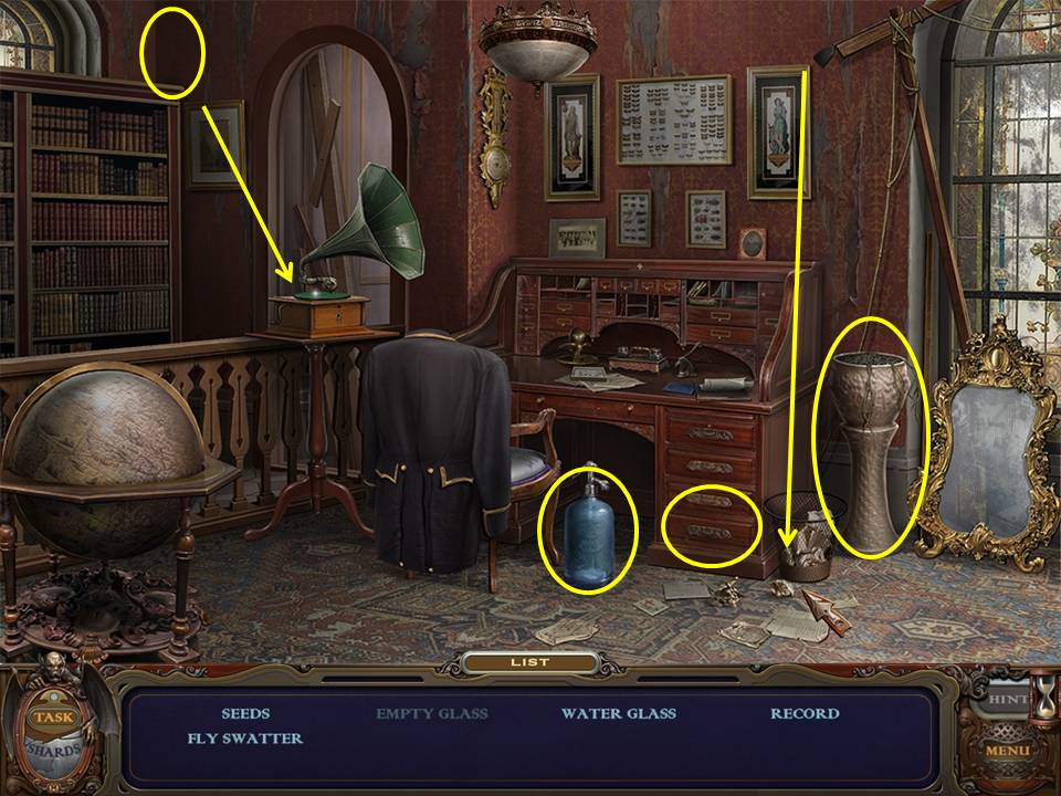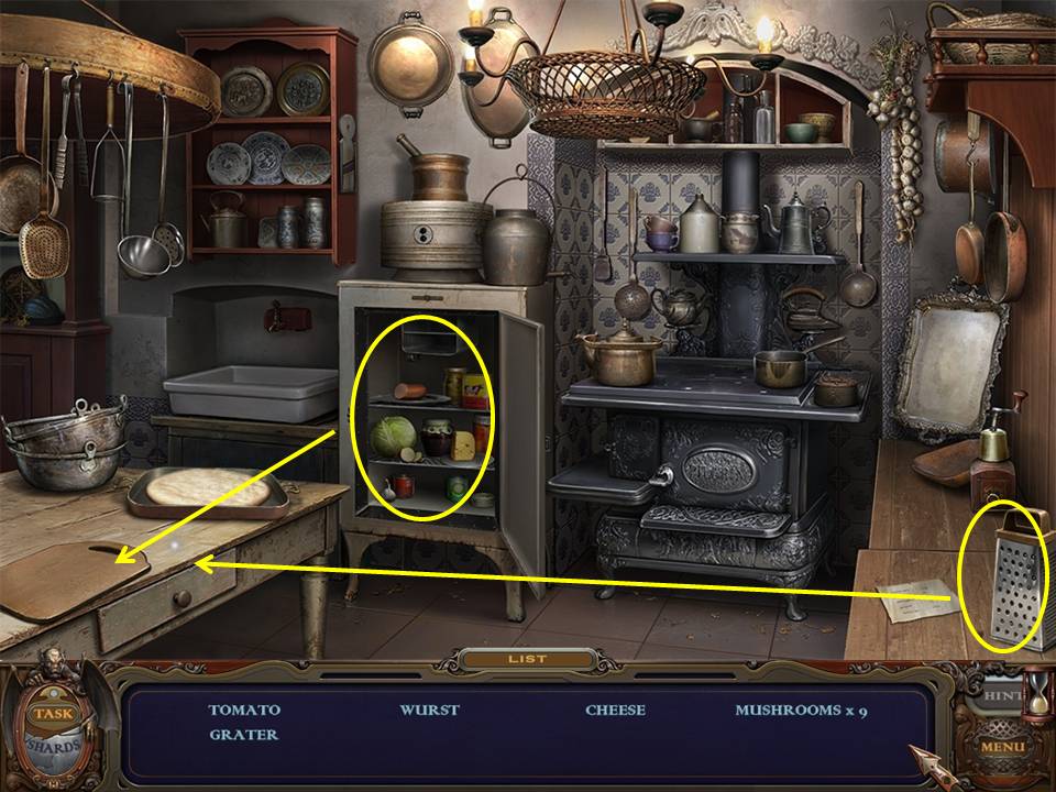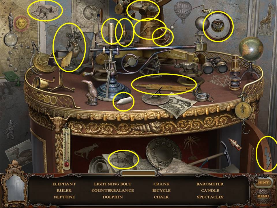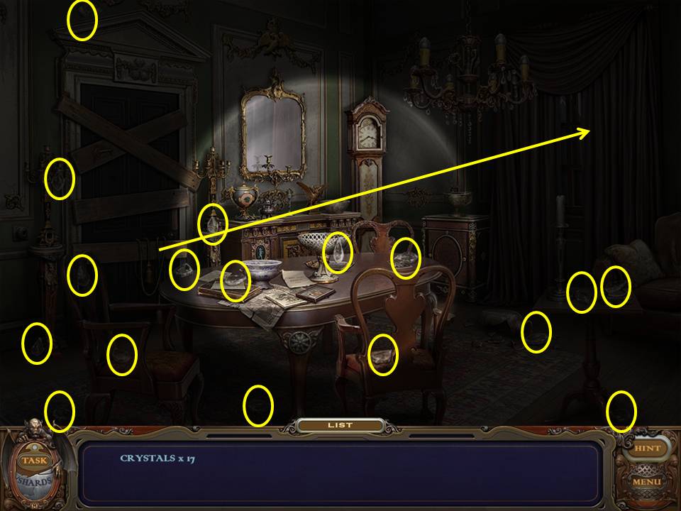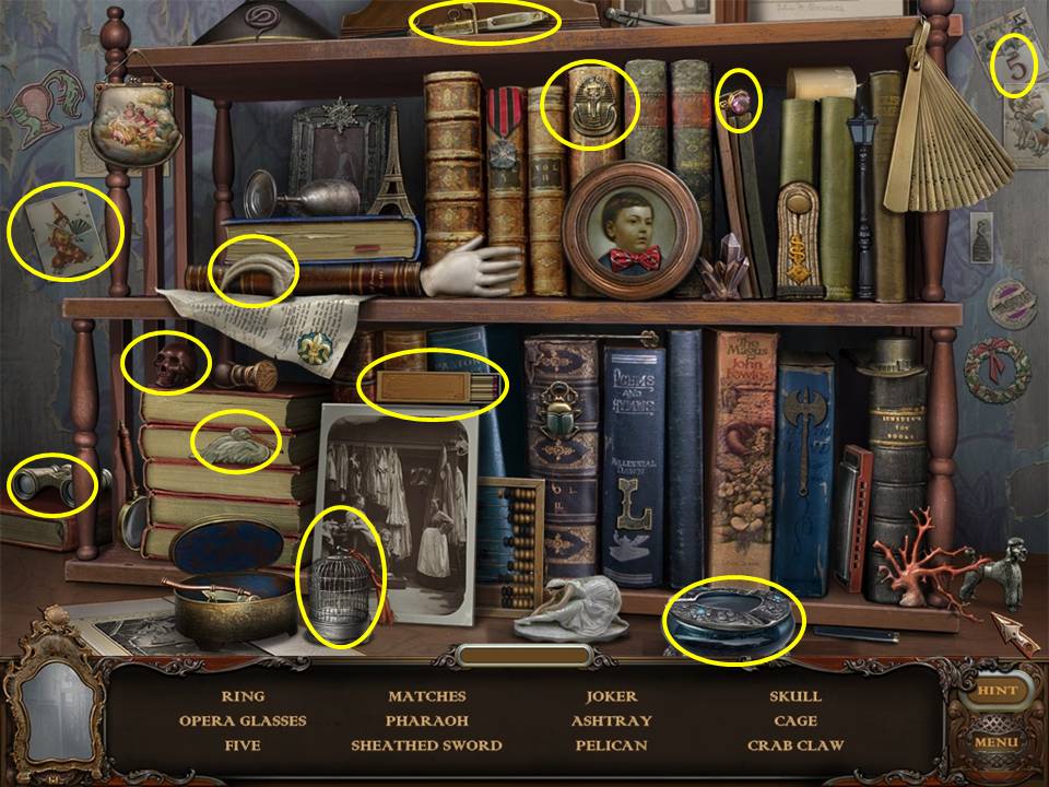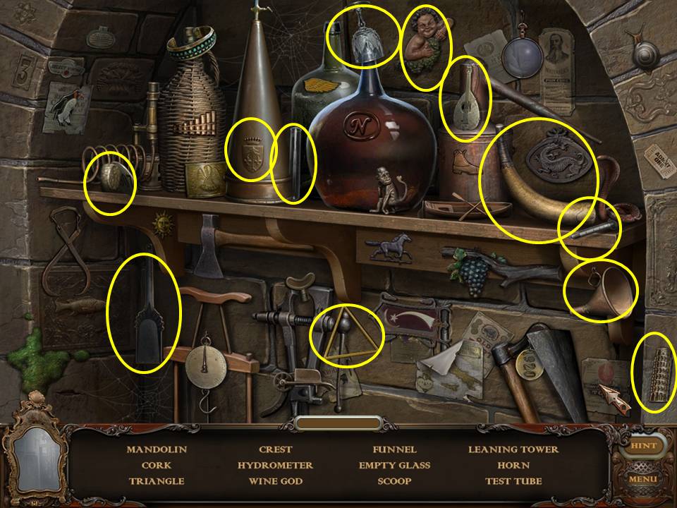 Return to the Sarcophagus to discover 10 glowing shards. Each will take you back to a Hidden Object Area where you will find the items listed as well as 10 of 12 ZODIAC SIGNS. Don't forget that the Sarcophagus area itself contains your first two ZODIAC SIGNS (Cancer and Leo). You may click on the shards and play the resulting Hidden Object Areas in any order you desire.